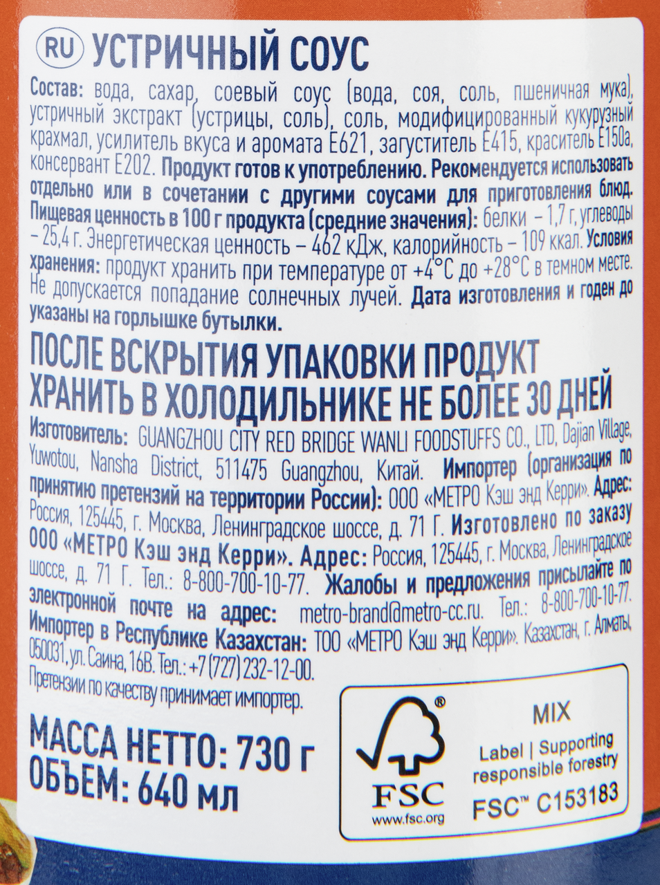 Вода, сахар, соевый соус (вода, соя, соль, пшеничная мука), устричныйэкстракт (устрицы, соль), соль, модифицированный кукурузный крахмал,усилитель вкуса и аромата E621, загустители E415, краситель E150а,консервант E202