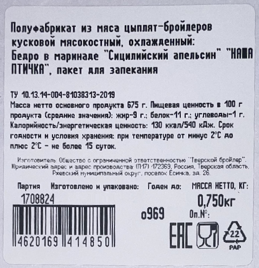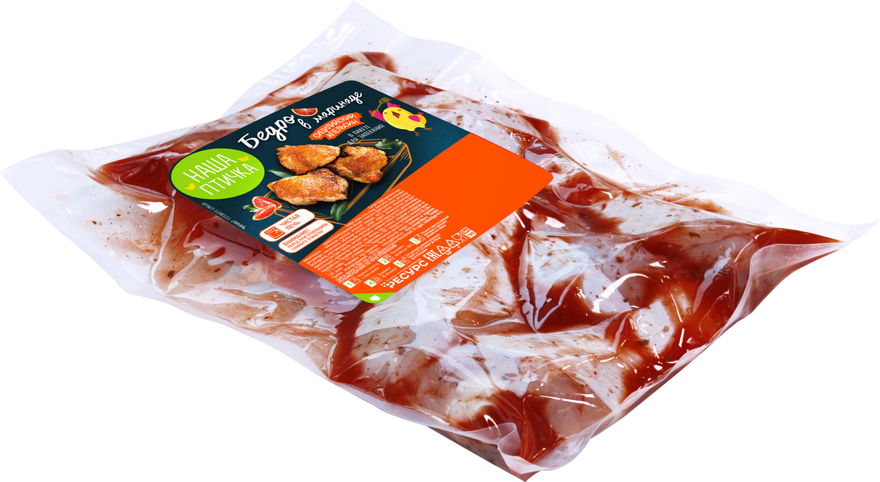 Бедро цыпленка-бройлера Наша птичка в маринаде Сицилийский апельсин охлажденное позволит сэкономить время при приготовлении обеда или ужина. Бедрышко уже замариновано в специях, и его можно запекать духовом шкафу в упаковке без этикетки. Не содержит ГМО.