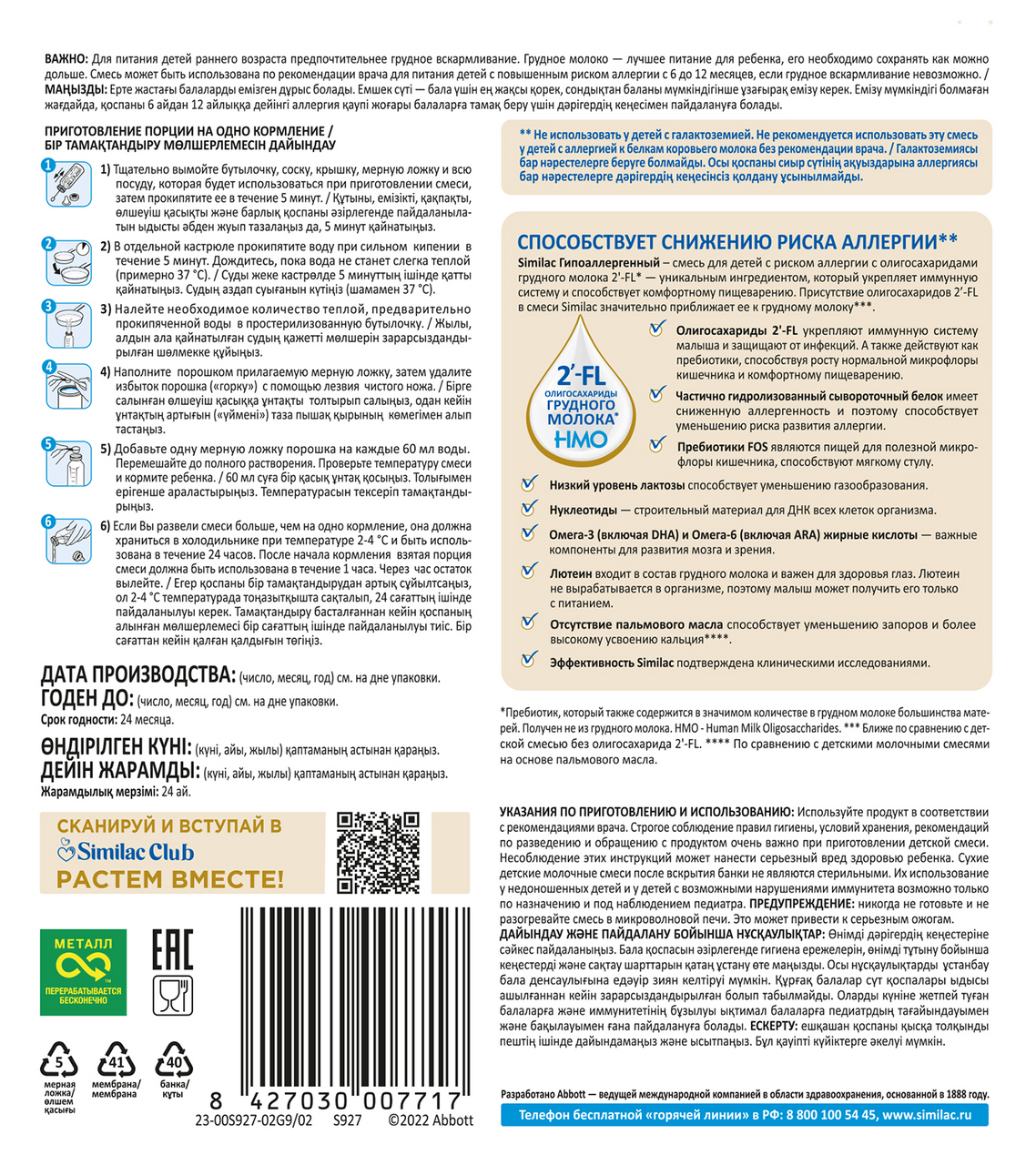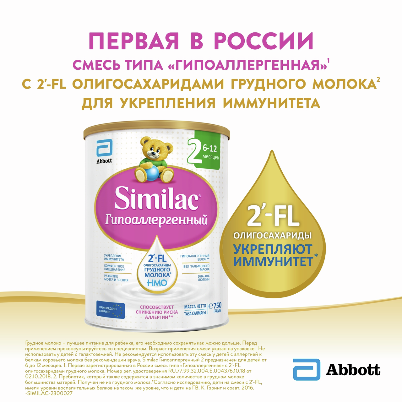 Смесь молочная Similac Гипоаллергенный 2 – состав для детей с риском аллергии. Он содержит олигосахариды грудного молока 2'-FL – уникальный ингредиент, который ранее был обнаружен только в грудном молоке. Это вещество стимулирует рост полезных бактерий в кишечнике, защищает организм ребенка от инфекций и способствует укреплению иммунитета. Частично гидролизованный сывороточный белок имеет сниженную аллергенность и поэтому способствует уменьшению риска развития аллергии. Пребиотики FOS являются пищей для полезной микрофлоры кишечника, способствуют мягкому стулу.