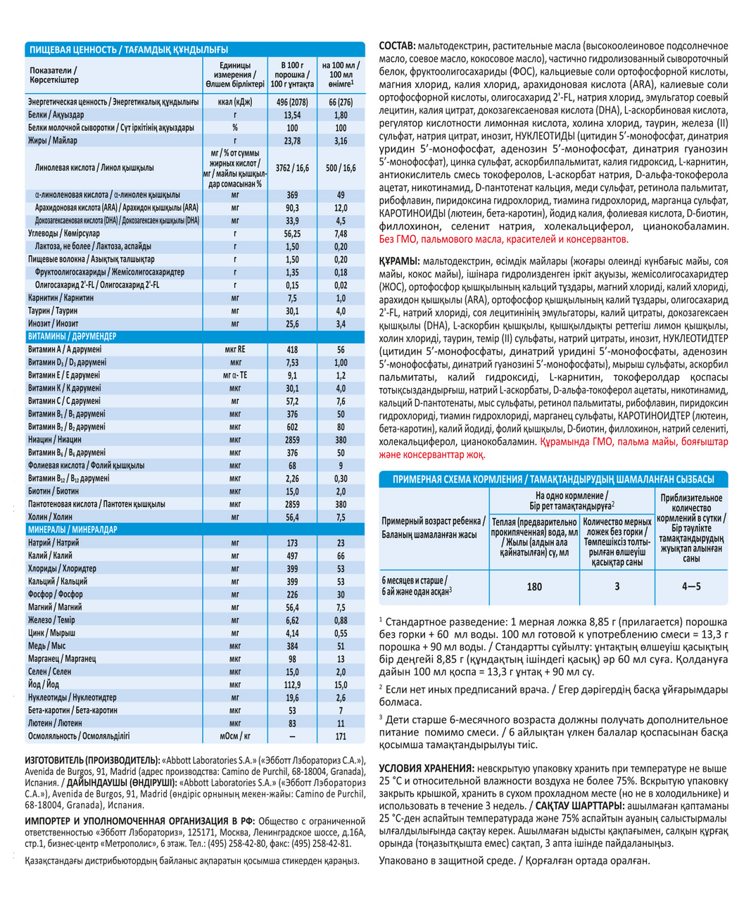 Обезжиренное молоко, лактоза, растительные масла (высокоолеиновое подсолнечное масло, кокосовое масло, соевое масло), концентрат сывороточного белка, фруктоолигосахариды (ФОС), минералы (калия цитрат, кальция карбонат, натрия цитрат, натрия хлорид, магния хлорид, железа (II) сульфат, цинка сульфат, кальциевые соли ортофосфорной кислоты, меди сульфат, марганца сульфат, йодид калия, селенит натрия), гидролизат сывороточного белка, арахидоновая кислота (АRA) из масла M. alpina, олигосахарид 2-FL, ВИТАМИНЫ (витамин C, холин, ниацин, пантотеновая кислота, витамин А, витамин B1, витамин B6, фолиевая кислота, витамин К1, витамин B2, биотин, витамин D3, витамин В12), эмульгатор соевый лецитин, докозагексаеновая кислота (DHA) из масла C. cohnii, инозит, Bifidobacterium lactis (не менее 106 КОЕ/г), таурин, L-триптофан, НУКЛЕОТИДЫ (цитидин 5-монофосфат, динатрия уридин 5-монофосфат, аденозин 5-монофосфат, динатрия гуанозин 5-монофосфат), антиокислитель смесь токоферолов, L-карнитин, каротиноиды (лютеин, бета-каротин).
