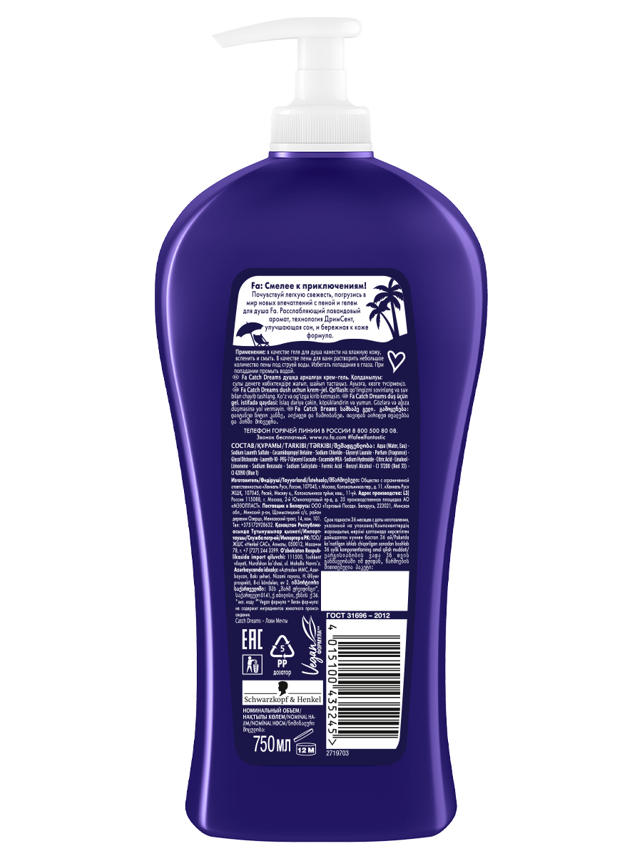 Fa: Смелее к приключениям! Почувствуй легкую свежесть, погрузись в мир новых впечатлений с пеной и гелем для душа Fa 2-в-1. Расслабляющий лавандовый аромат, технология ДримСент, улучшающая сон, и бережная к коже формула.