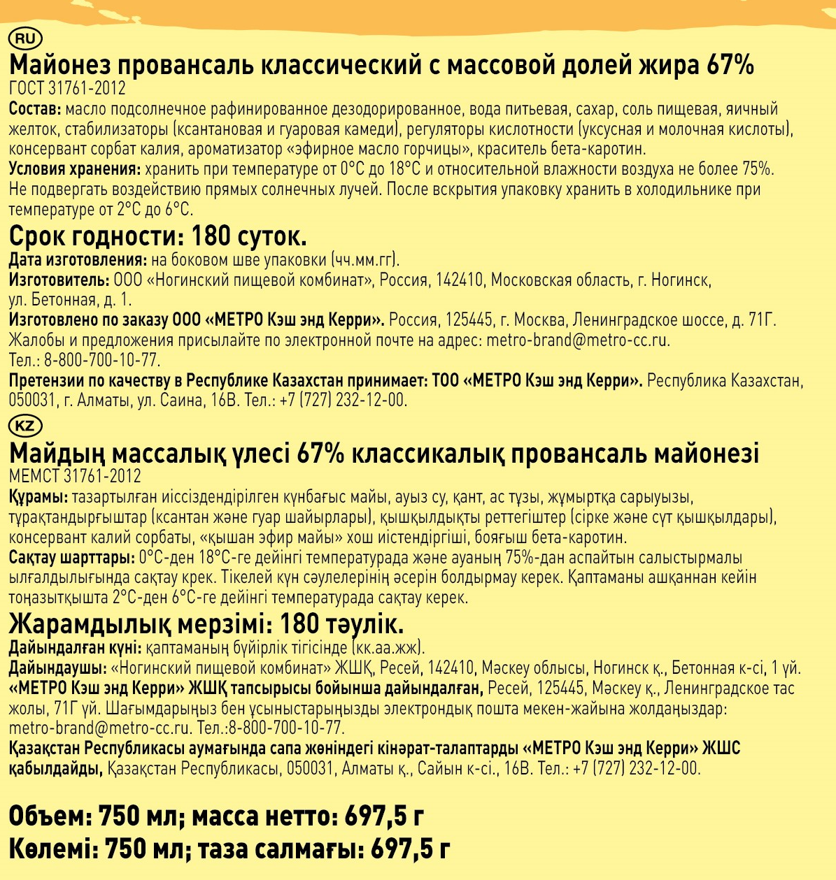 Масло подсолнечное рафинированное дезодорированное, вода питьевая, сахар, соль пищевая, яичный желток, стабилизаторы (ксантановая и гуаровая камедь), регуляторы кислотности (уксусная и молочная кислоты), консервант сорбат калия, ароматизатор эфирное масло горчицы, краситель бета-каротин.
