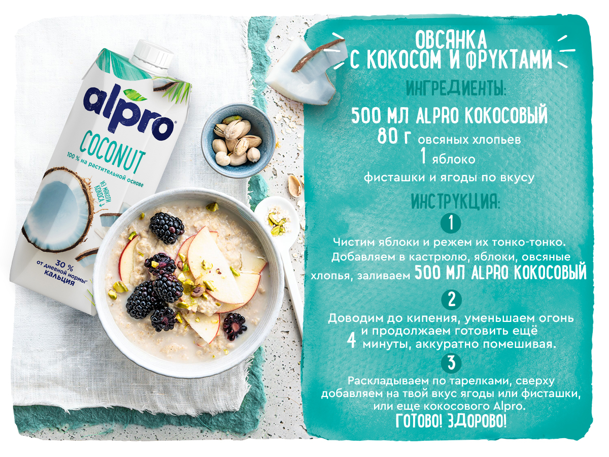 Ура! Ты делаешь правильный выбор! Попробуй кокосовый Alpro и насладись его необыкновенно экзотическим вкусом и пользой. Ведь наш напиток является источником кальция. Также в кокосовом орехе содержатся пищевые волокна и минералы, полезные для твоего организма. Alpro отлично подойдет для завтрака - приготовь кашу и блинчики по-кокосовому или насладись тропическим вкусом прямо из стакана. Теперь в новом более доступном формате! Здорово!