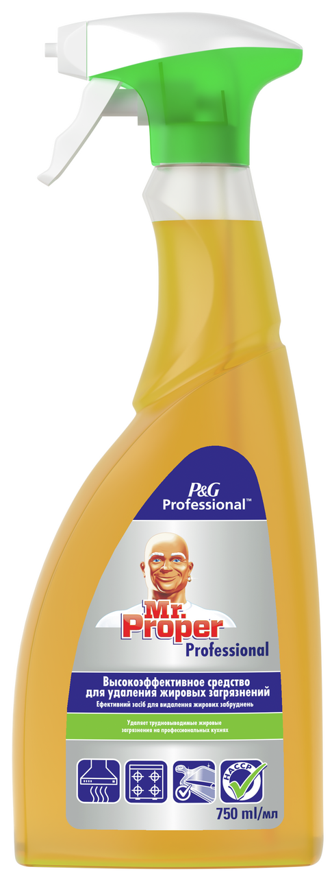 Мощное обезжиривающее средство спрей, 750мл Готовый к использованию спрей для обезжиривания сильно загрязненных кухонных поверхностей, в том числе поверхностей, которые непосредственно контактируют с продуктами. Используйте Mr. Proper Professional для выдающихся бизнес-результатов: Безопасно - Благодаря проверенному качеству известного бренда на рынке - Mr. Proper. - Без отдушки и хлорки. - Безопасно для обработки поверхностей, контактирующих с продуктами. - Для профессионального использования. Просто - Продукт готов к использованию.