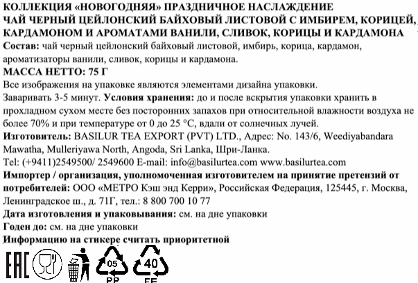 Встречайте чай Basilur из коллекции Новогодняя - напиток, который окутает вас атмосферой праздничного наслаждения. В изысканной новогодней упаковке скрывается настоящий шедевр - чёрный цейлонский листовой чай, щедро приправленный имбирём, корицей и кардамоном. Этот богатый и ароматный напиток согреет вас в холодные зимние дни и подарит ощущение уюта и тепла. Аромат ванили, сливок, корицы и кардамона создаёт неповторимую атмосферу праздника и волшебства. Каждый глоток этого чая - настоящее удовольствие для ценителей изысканных вкусов. Подарите себе и своим близким на Новый Год и Рождество моменты радости и наслаждения с чаем Basilur из новогодней коллекции. Пусть каждый день станет праздником, наполненным теплом и уютом.