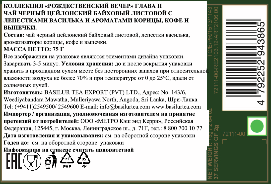 Чай подарочный черный Basilur Рождественский вечер, 75г