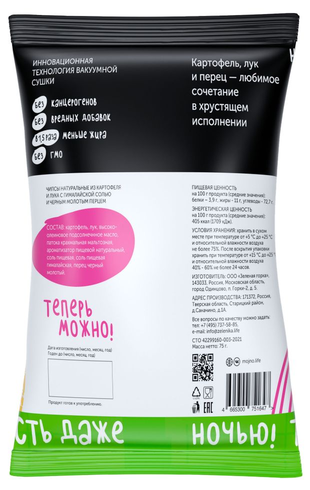 Чипсы Mojno Лук, Гималайская соль и черный молотый перец, 75г
