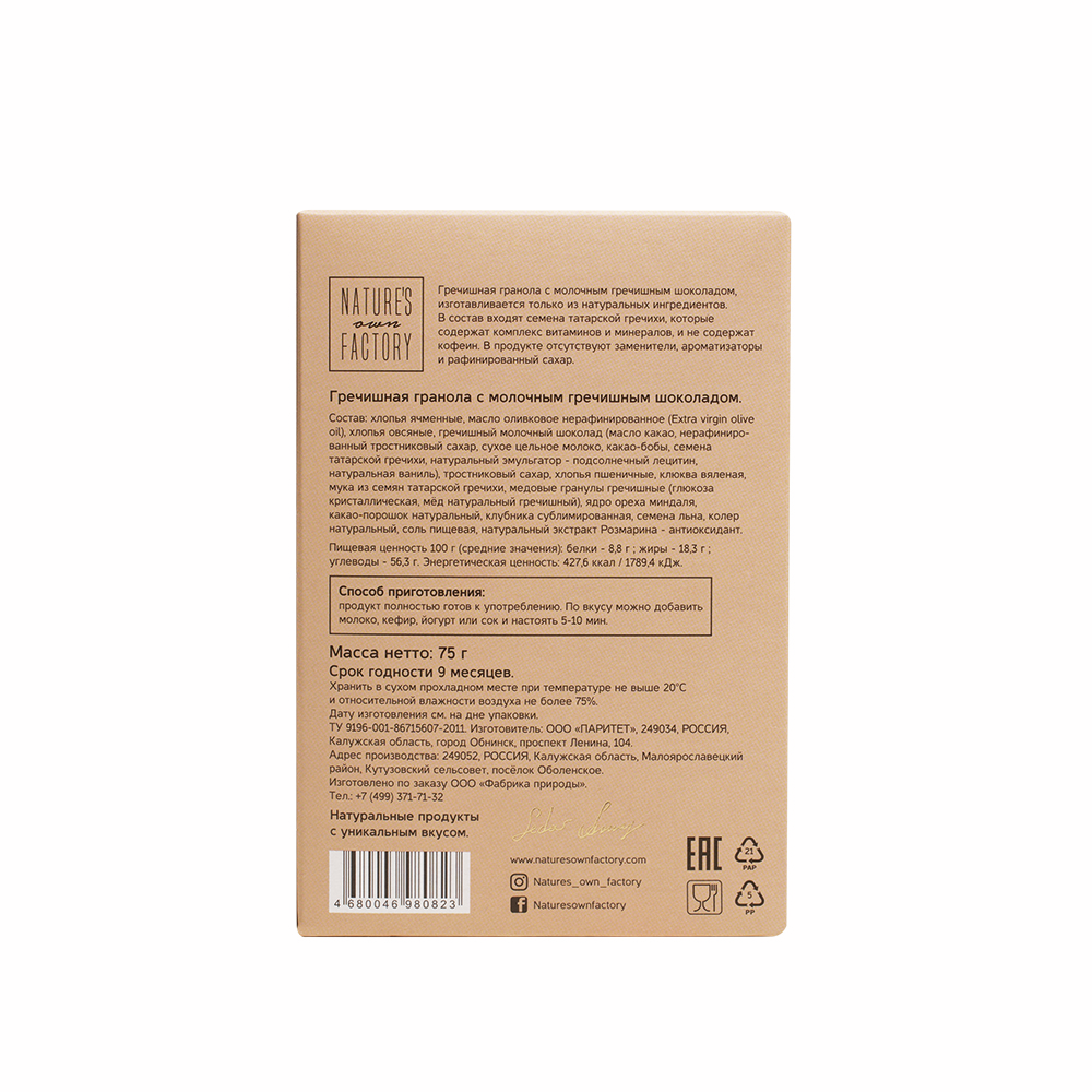 Гречишная гранола Nature's Own Factory с молочным гречишным шоколадом, 75г
