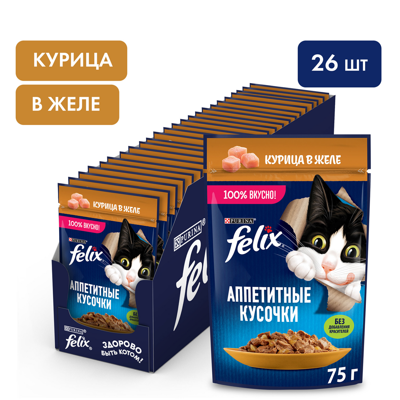 Корм влажный Felix Аппетитные кусочки для взрослых кошек с курицей в желе, 75г х 26 шт