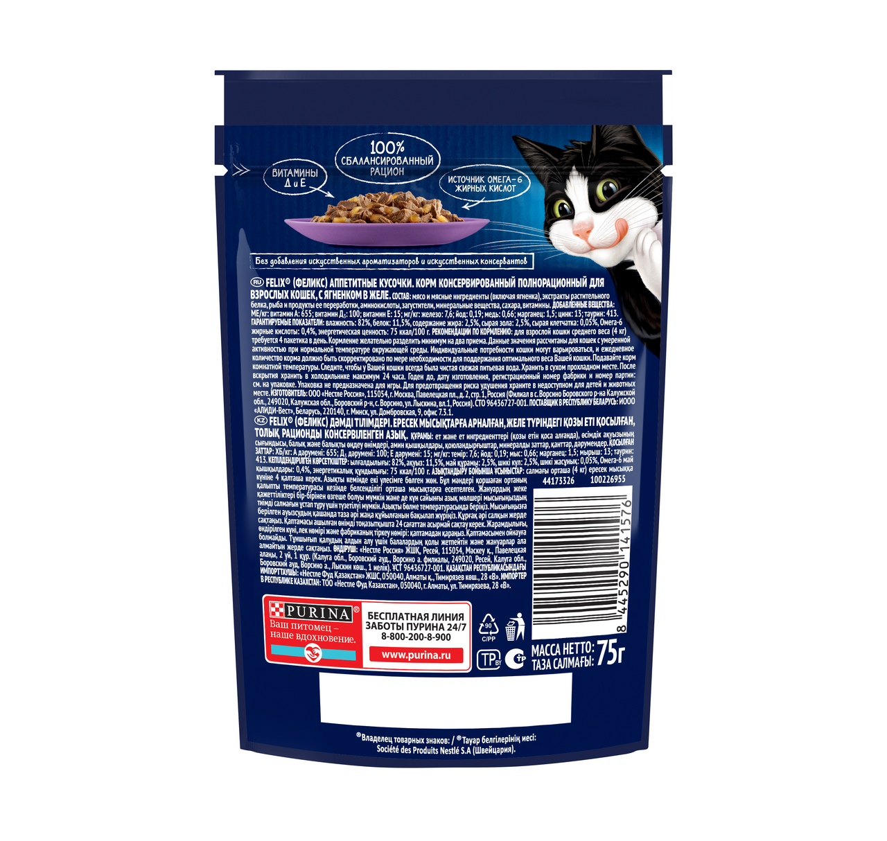 Каждый котик желает наслаждаться совершенно особенным кормом, у которого будет такой аппетитный вид и аромат, словно Вы приготовили его сами. Каждый пакетик корма для взрослых кошек Аппетитные кусочки содержит нежные кусочки в сочном желе – вкуснятину, от которой кота за уши не оттащишь! Эксперты Purina, разрабатывая влажные корма для домашних любимцев, создали корм для взрослых кошек Felix Аппетитные кусочки — специально для Вашего любителя вкуснятины. Влажный корм для кошек Felix Аппетитные кусочки — полнорационный, содержит все необходимое для здоровой активной долгой жизни.