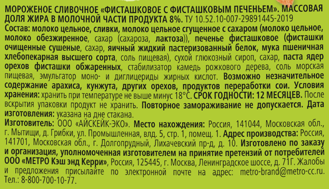 Молоко цельное, сливки пастеризованные, молоко цельное сгущенное с сахаром молоко цельное, молоко обезжиренное, сахар сахароза, лактоза, печенье фисташковое фисташки очищенные сушеные, сахар, яичный жидкий пастеризованный белок, мука пшеничная хлебопекарная высшего сорта, соль пищевая, сухой глюкозный сироп, сахар, паста ядер орехов фисташки обжаренных, камедь рожкового дерева стабилизатор, соль морская пищевая, эмульгатор - моно- и диглицериды жирных кислот.