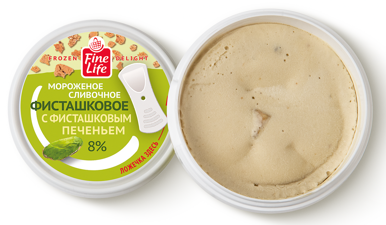Фисташковое мороженое Fine Life с фисташковым печеньем изготовлено из натуральной фисташки. В мороженом не используются красители и ароматизаторы. Внутрь стаканчика помещена ложка, так что мороженое удобно есть в любом месте.