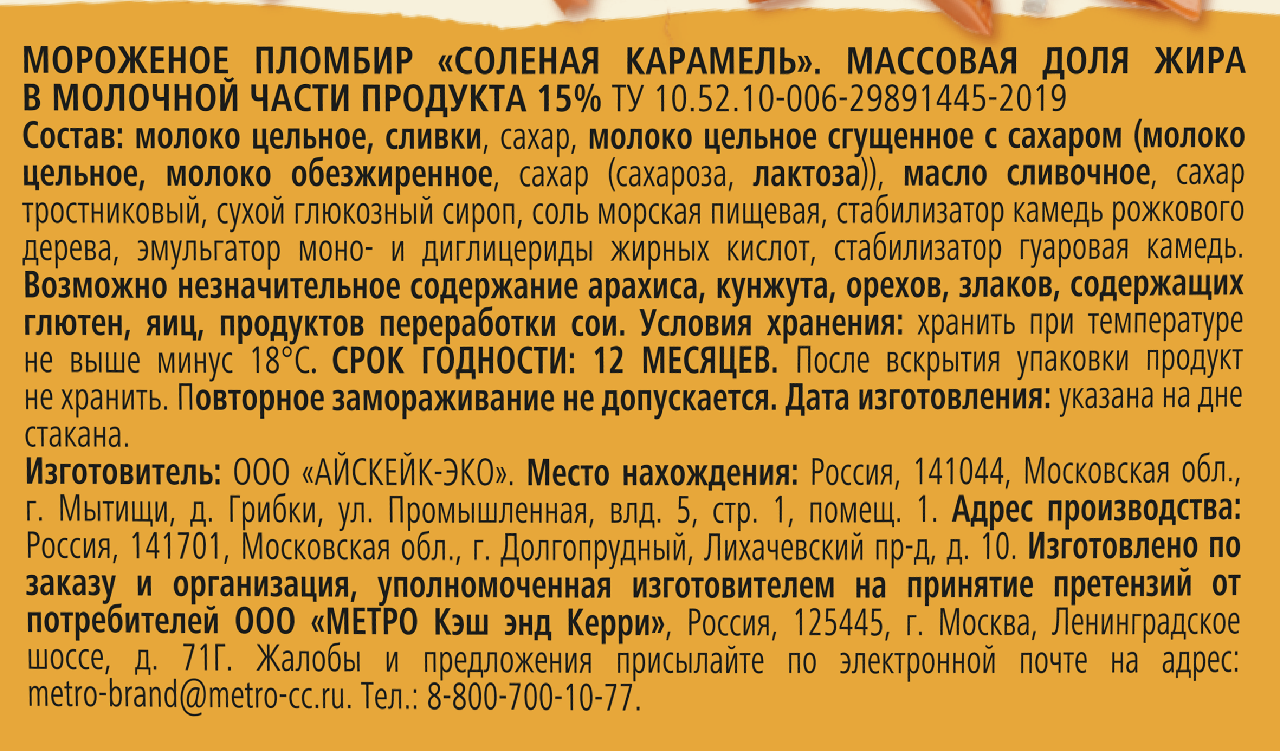Молоко цельное пастеризованное, карамельный соус сливки пастеризованные, сахар, масло сливочное сливки пастеризованные, сахар тростниковый нерафинированный Мусковадо, сироп глюкозный сухой, соль морская, молоко цельное сгущенное с сахаром молоко цельное, молоко обезжиренное, сахар сахароза, лактоза, стабилизаторы камедь рожкового дерева, гуаровая камедь, эмульгатор моно- и диглицериды жирных кислот.