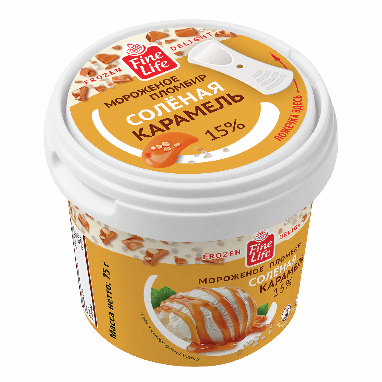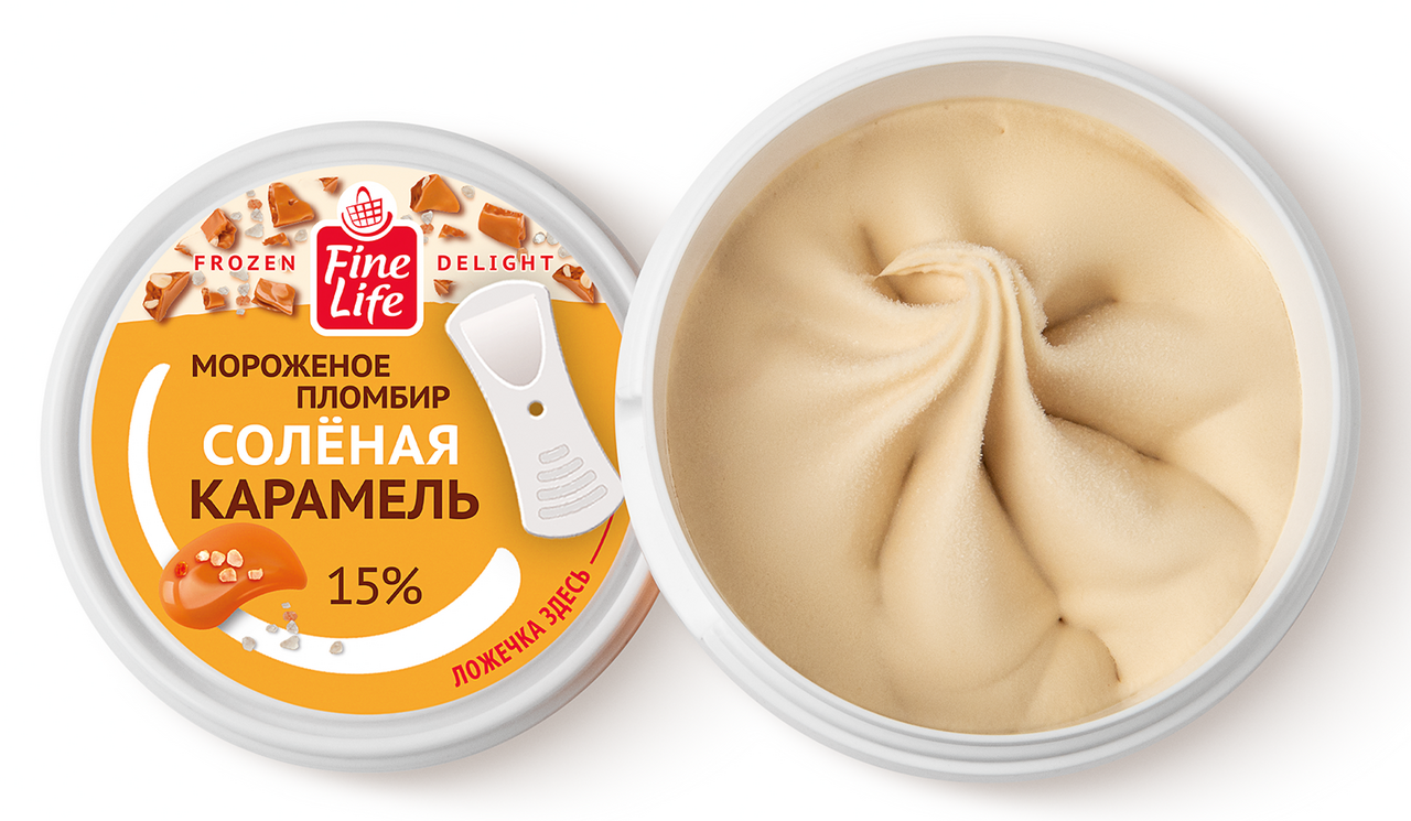 Для каждой новой партии пломбира Fine Life солёная карамель на производстве вручную готовят карамельный соус по рецептам французских кондитеров.В этом рецепте соль добавляется в готовую смесь, в самом конце перед замораживаем.Внутрь стаканчика помещена ложка, так что мороженое удобно есть в любом месте.