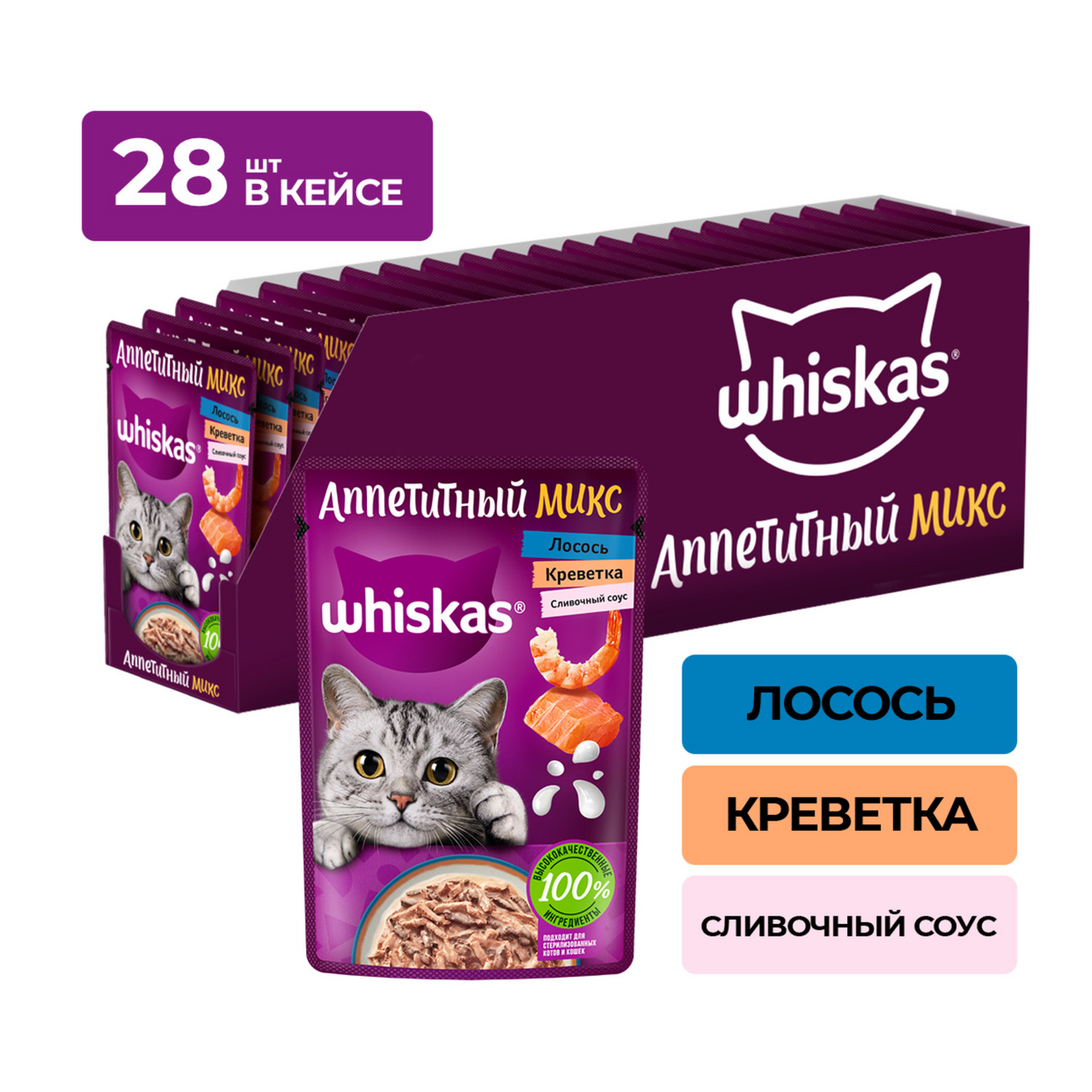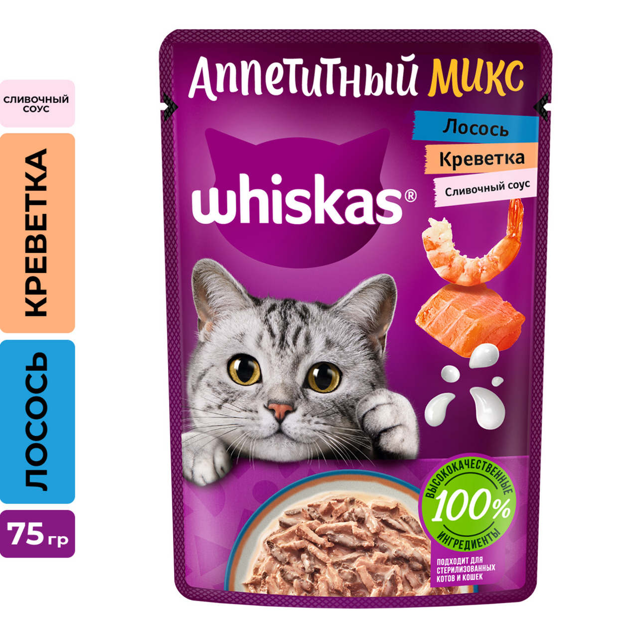 Корм влажный Whiskas Аппетитный микс для взрослых кошек с лососем и креветками в сливочном соусе, 75г