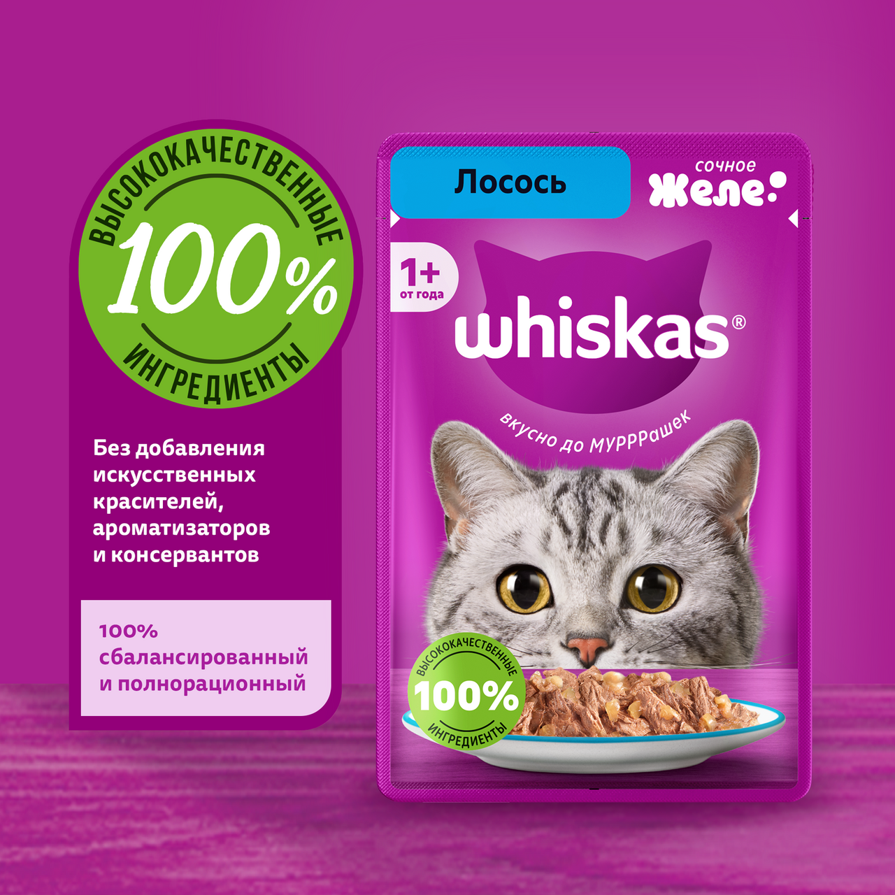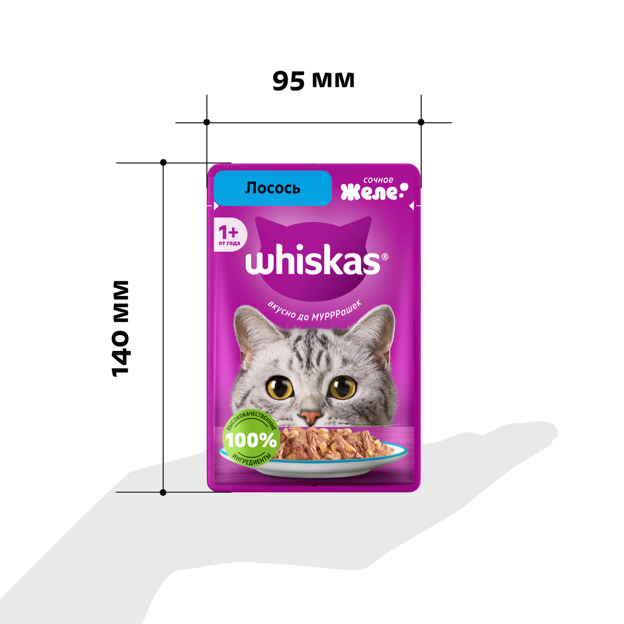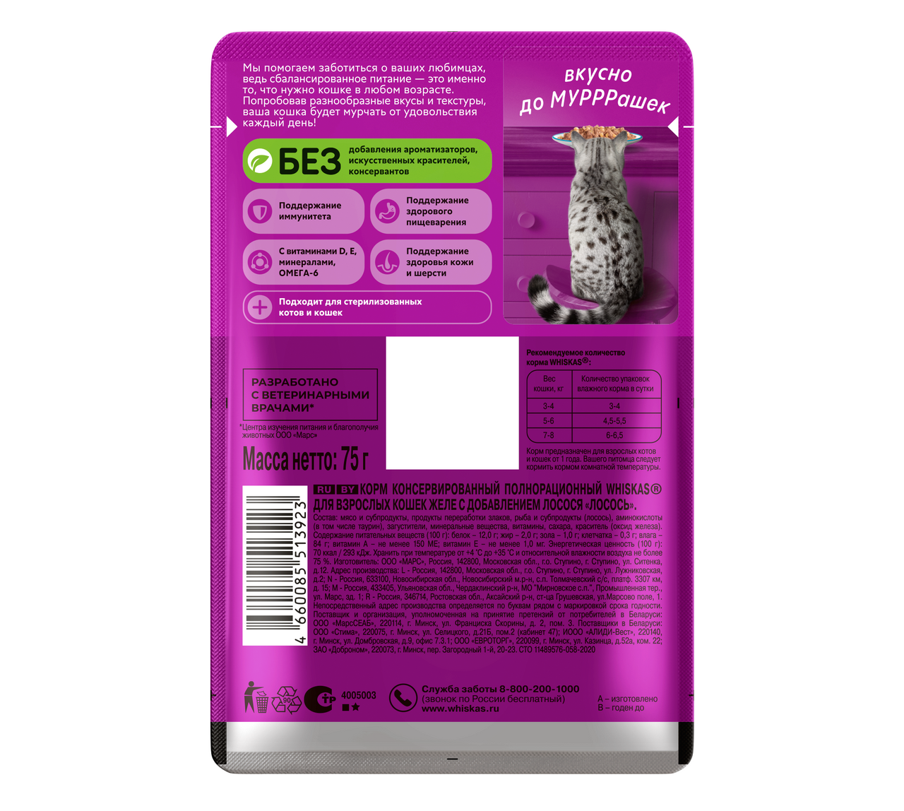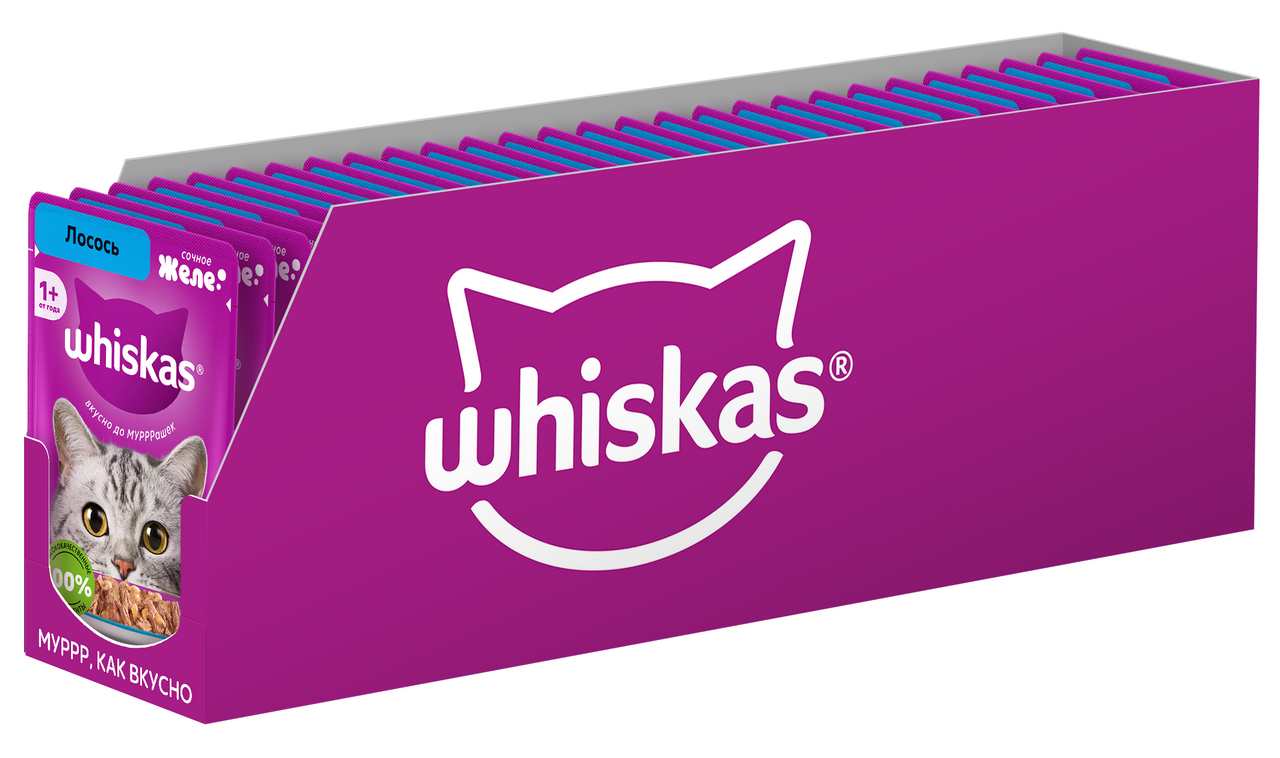 Это сбалансированный рацион, приготовленный именно так, как любит ваша кошка. Отборные мясные кусочки с лососем в аппетитном желе придутся по вкусу вашей любимице. Жизнь замурррчательна, ведь рацион Whiskas содержит все необходимое, чтобы еда вашей кошки была не только вкусной, но и полезной. Whiskas поддержит иммунитет, позаботится о здоровом пищеварении и здоровье кожи и шерсти вашей кошки. Подходит для стерилизованных котов и кошек. 100% натуральные высококачественные ингредиенты: мясо и субпродукты – без добавления ароматизаторов, искуственных красителей и консервантов. Оптимальный баланс питательных веществ для полноценной жизни. Все необходимое для поддержания здоровья вашей любимицы: Омега-6, кальций, фосфор и таурин, витамин D и Е, цинк. Ваша кошка будет мурчать от удовольствия!