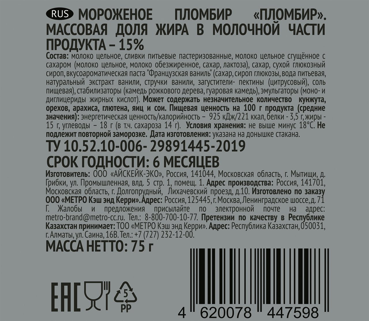Изготовлен из цельного молока и других натуральных ингредиентов. Аппетитное мороженое с выразительным нежным вкусом понравится детям и взрослым.