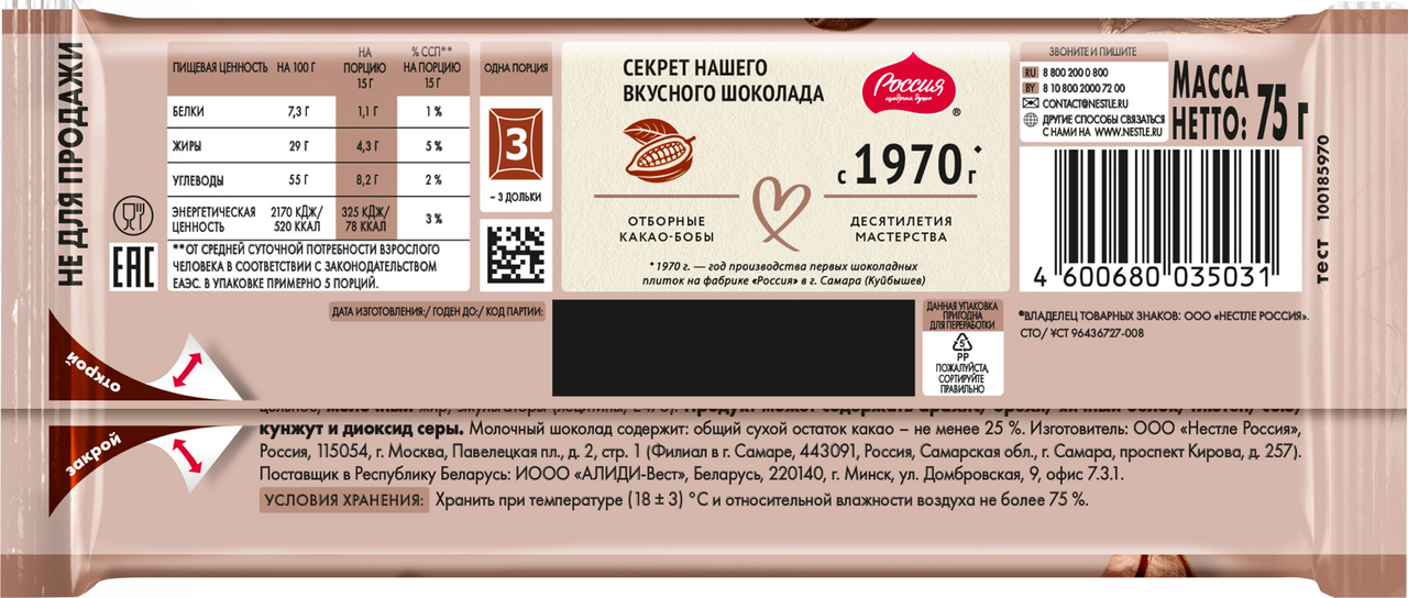 Шоколад Россия-щедрая душа! Кофе с молоком - это настоящая бодрая классика, сохраняющая эталон вкуса на протяжении времени. Бархатистый молочный шоколад и терпкий вкус кофе создают неповторимый дуэт, радуя как любителей кофе, так и любителей насыщенного вкуса шоколада. Изящная обновленная форма дольки шоколада раскрывает всю яркость вкуса, заставляя шоколад медленно таять во рту.