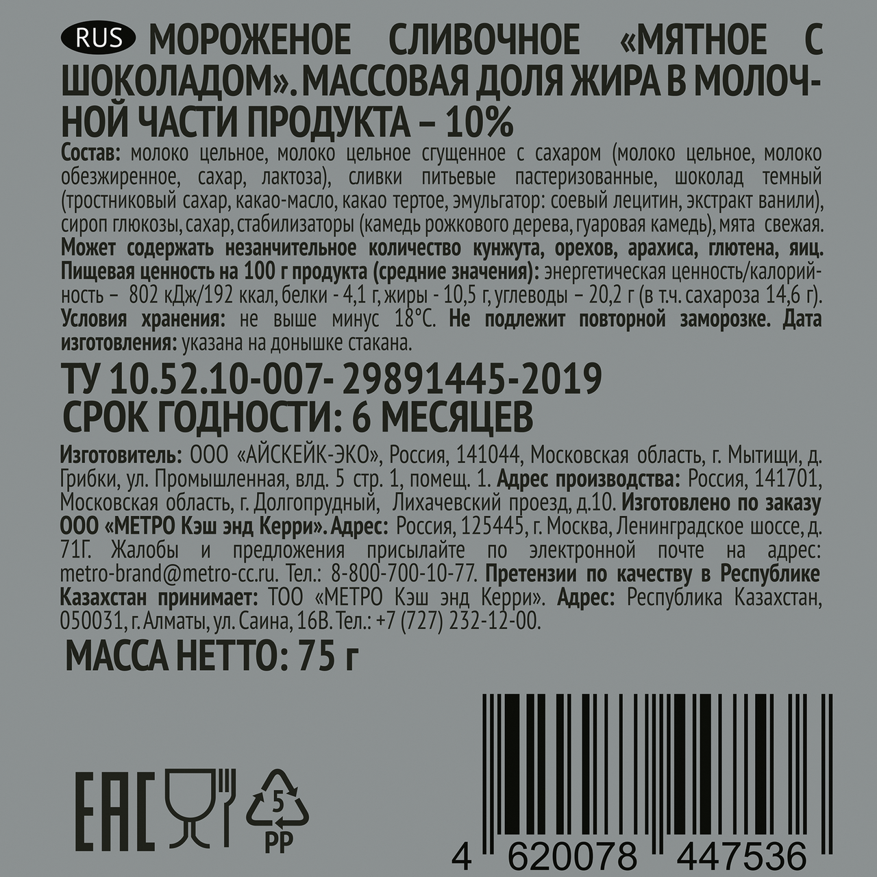 В основу из сливок и цельного молока с белым и виноградным сахаром добавлены свежая мята и шоколадная крошка.