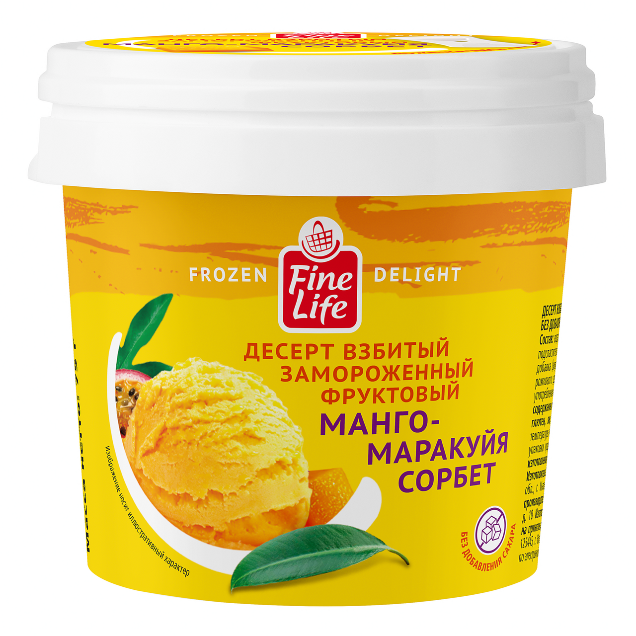 Сорбет манго-маракуйя Fine Life приготовлен из натурального пюре манго и маракуйи и не содержит сахар. Внутрь стаканчика помещена ложка, так что сорбет удобно есть в любом месте.