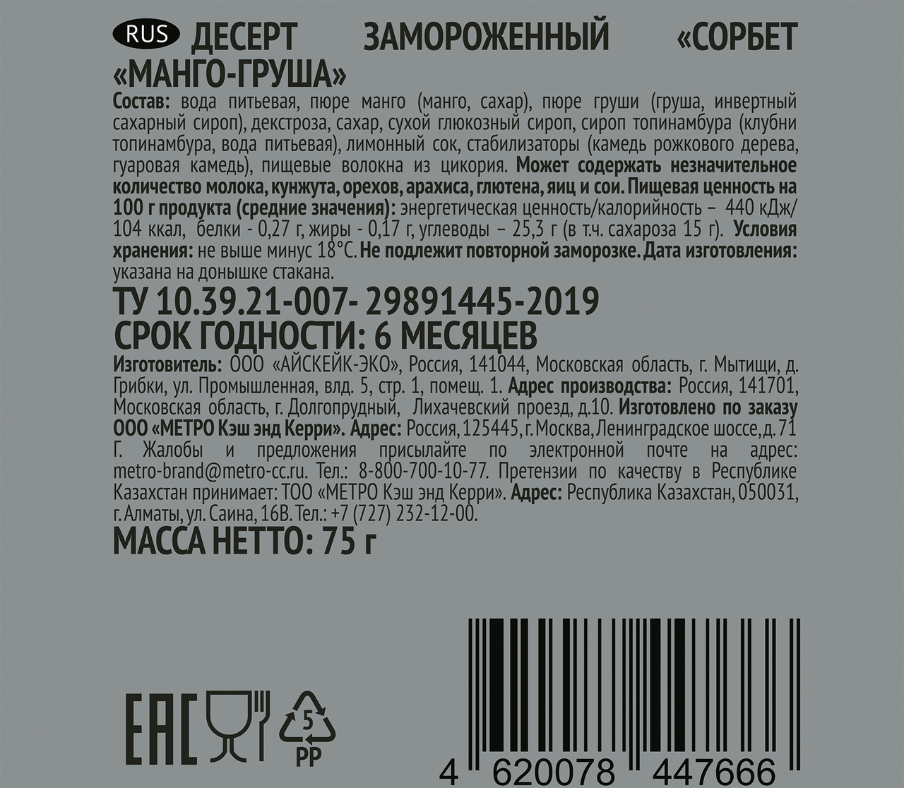 Вода, пюре манго (манго, сахар), пюре из груши (груша, инвертный сахарный сироп), сахар, декстроза, сироп глюкозы, лимонный сок, сироп топинамбура, стабилизаторы (камедь рожкового дерева, гуаровая камедь).