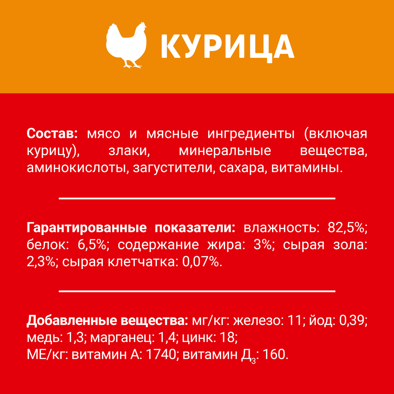 Мясо и мясные ингредиенты (включая курицу), злаки, минеральные вещества, аминокислоты, загустители, сахара, витамины.