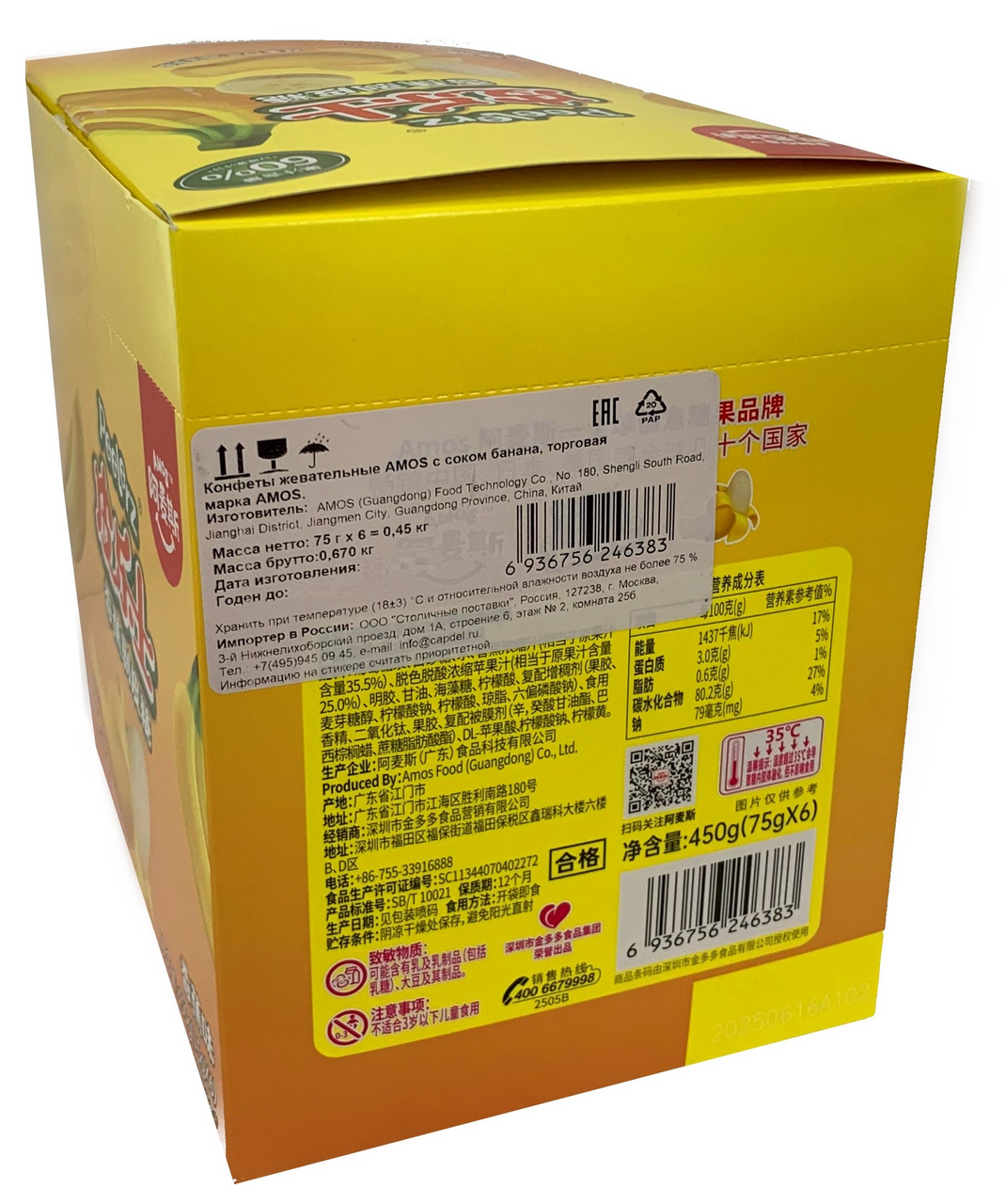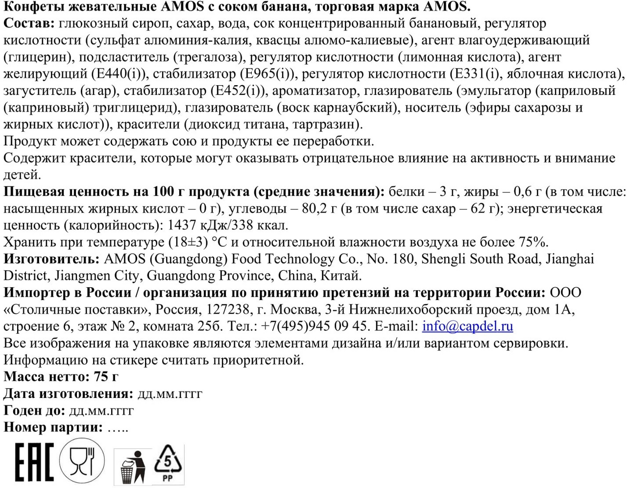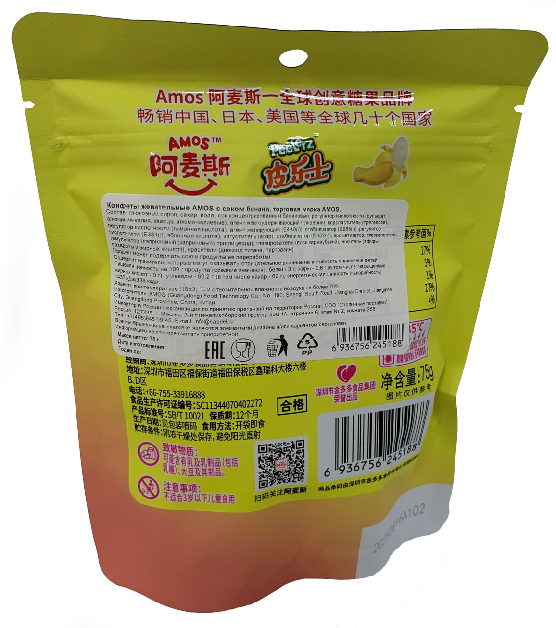 Бренд Amos в Китае является уважаемым и влиятельным на рынке кондитерских изделий. Это влияние распространяется и за пределами Поднебесной, например, в Японии, Австралии, Германии, Франции, США, Канаде и Юго-Восточной Азии. Вся продукция компании проходит жесткую сертификацию и отвечает высоким мировым стандартам. Amos - конфеты в 4D объеме, оригинальной формы из натурального сока с незабываемым вкусом. Жевательный мармелад Amos предлагается в удобных zip-пакетах. Все конфеты обладают яркими ароматами и приятным вкусом, который хочется повторить снова и снова. Конфеты с виноградным соком, который придаёт им фруктовый вкус. Их удобно взять с собой или положить в ланч-бокс.