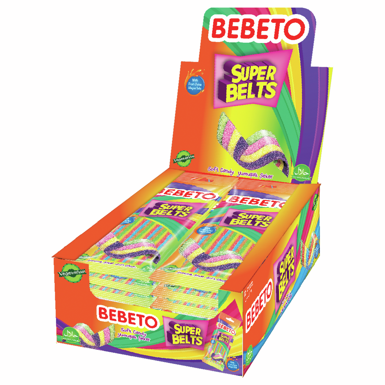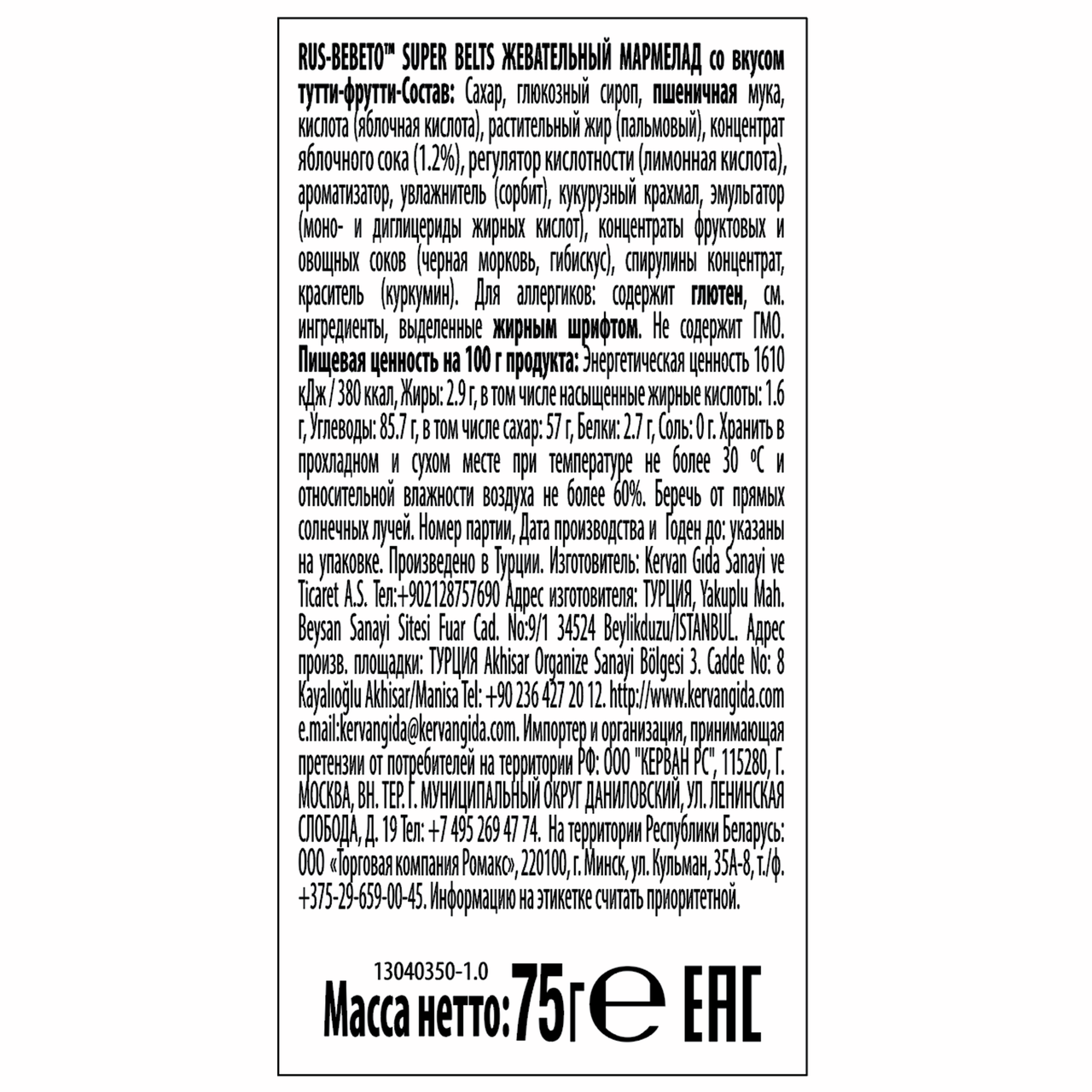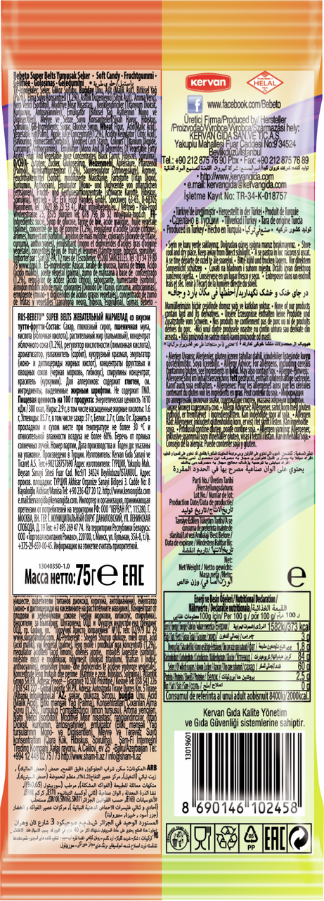 Кисло-сладкий жевательный мармелад в виде "ремней" сочетают в себе микс фруктовых вкусов. Яркий, насыщенный вкус фруктов усиливается кислой посыпкой, что в совокупности дает неповторимое наслаждение. Продукт не содержит ингредиентов животного происхождения, что делает его пригодным для употребления вегетарианцами.