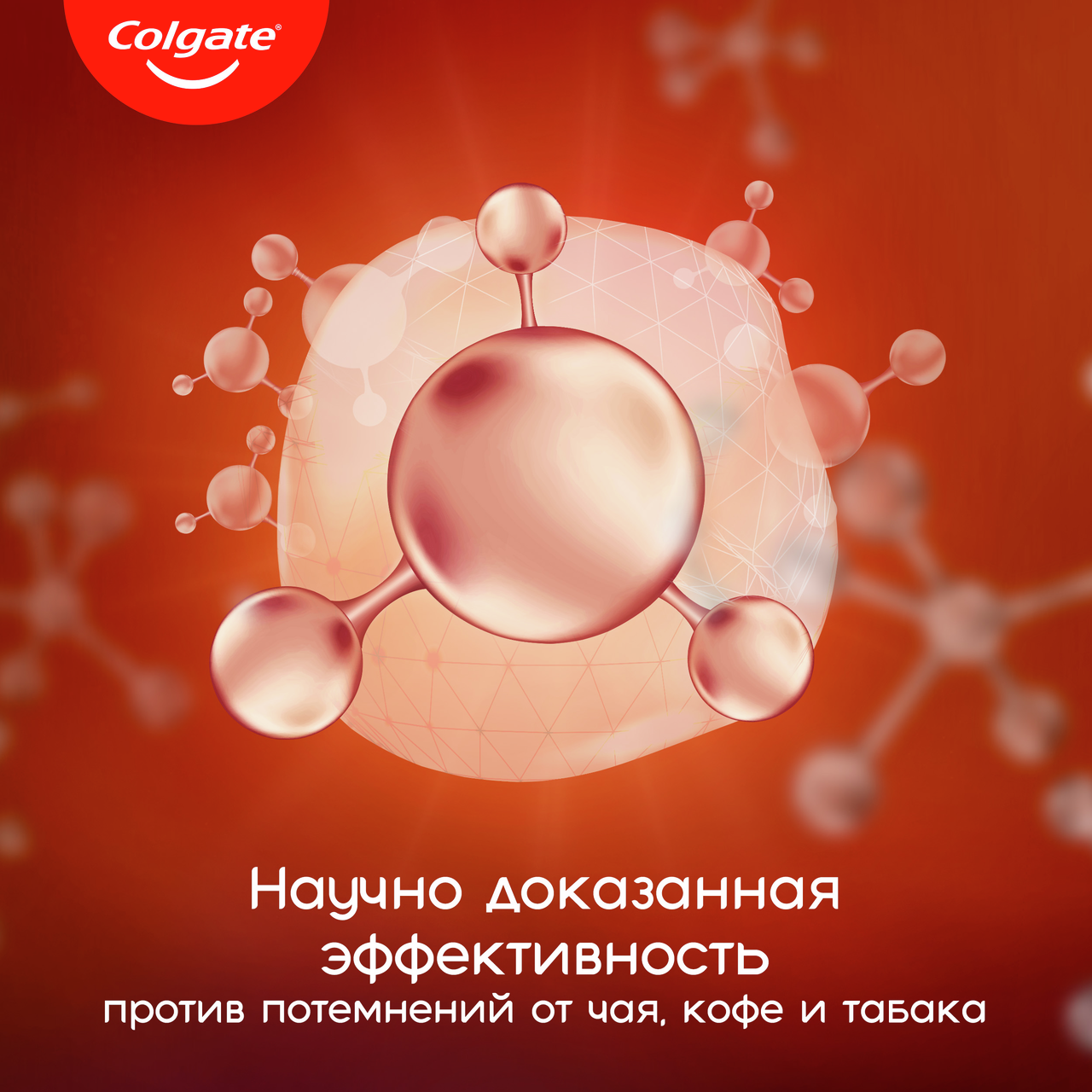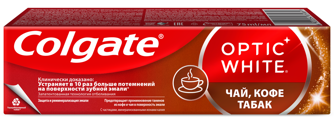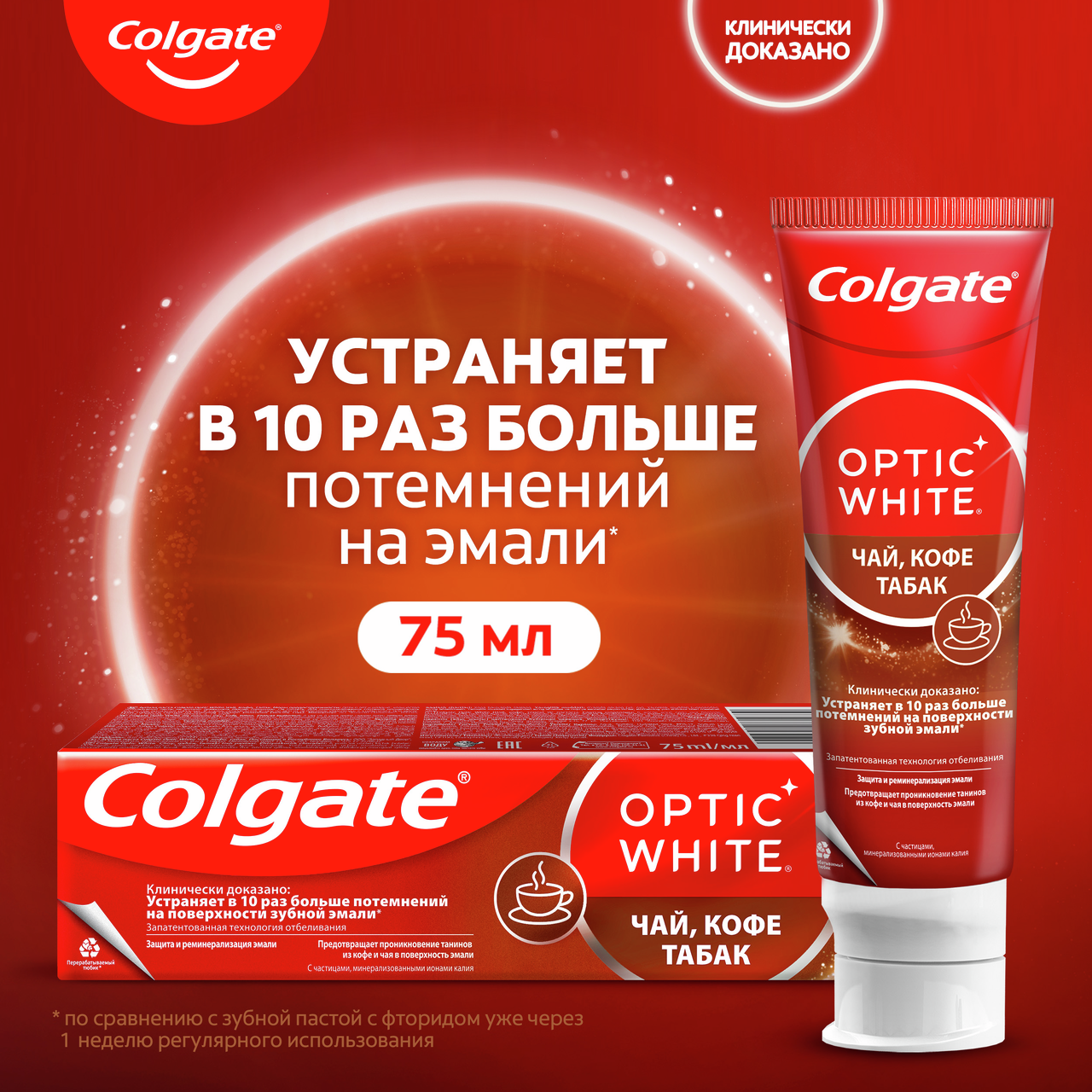 Отбеливающая зубная паста Colgate чай, кофе, табак устраняет в 10 раз больше потемнений на поверхности зубной эмали. Научно доказанная эффективность против потемнений от чая, кофе и табака!