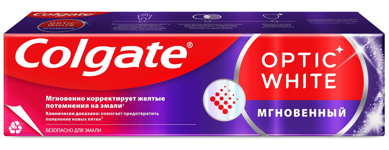 Отбеливающая зубная паста Colgate Optic White Мгновенный с технологией коррекции цвета для мгновенного корректирования желтых потемнений на эмали, 75мл. Помогает мгновенно корректировать желтые потемнения на эмали для ослепительной улыбки. Мгновенно корректирует желтые потемнения на эмали зубов. Клинически доказано, помогает предотвратить появление новых пятен и сохранить белизну ваших зубов. Безопасно для ежедневного использования. Безопасно для эмали. Приятный мятный вкус.