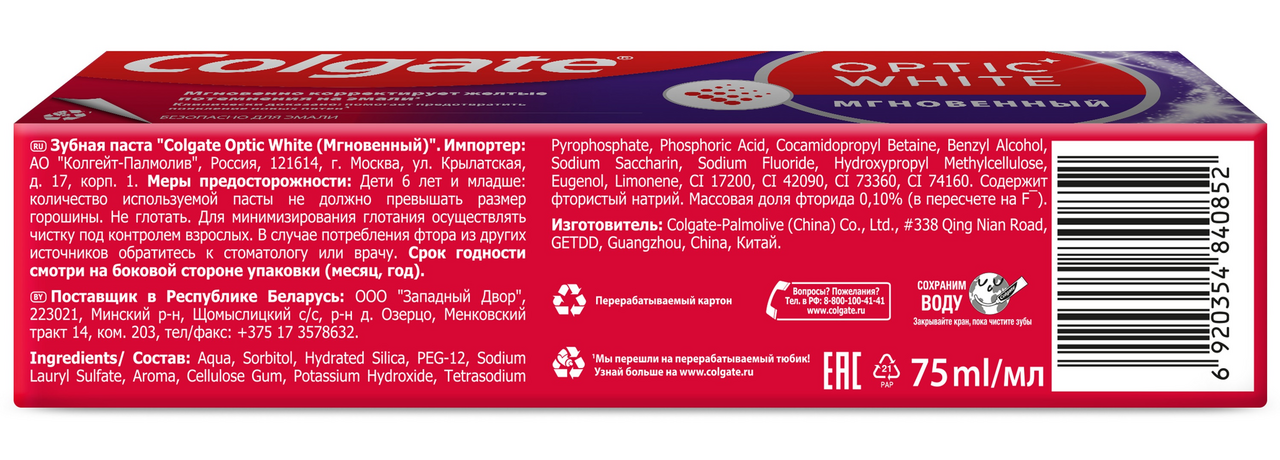 Зубная паста Colgate Optic White мгновенный, 75мл