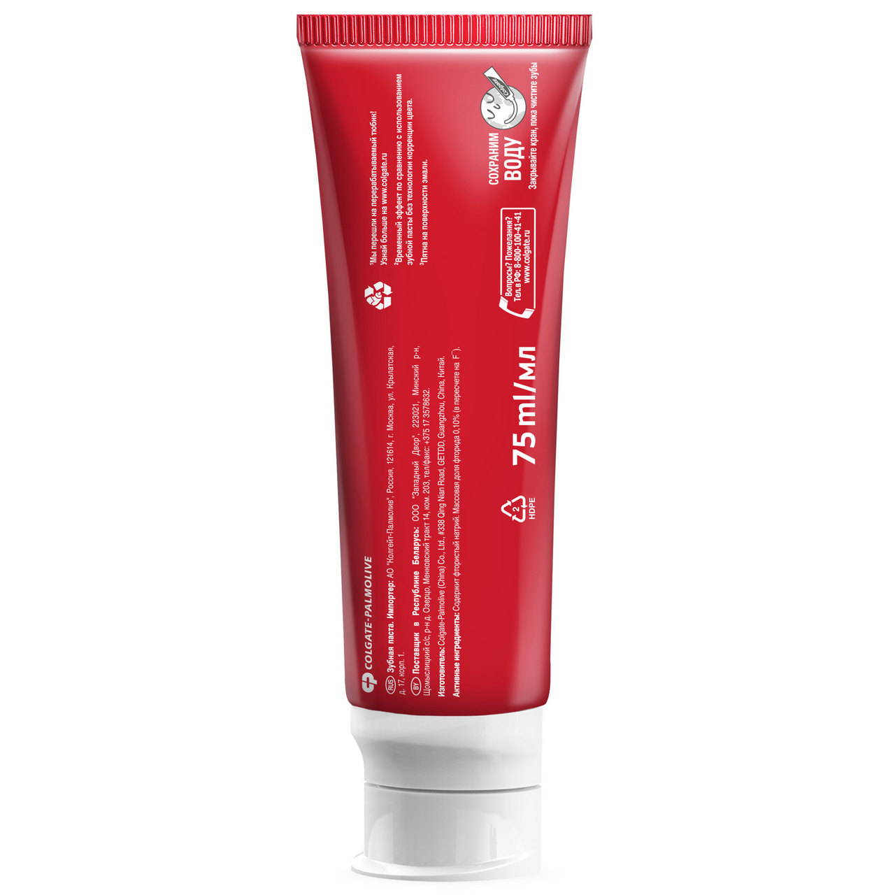 Aqua, sorbitol, hydrated silica, peg-12, sodium lauryl sulfate, aroma, cellulose gum, potassium hydroxide, tetrasodium pyrophosphate, phosphoric acid, cocamidopropyl betaine, benzyl alcohol, sodium saccharin, sodium fluoride, hydroxypropyl methylcellulose, eugenol, limonene, ci 17200, ci 42090, ci 73360, ci 74160 contains: sodium fluoride total fluoride content: 1000 ppm.