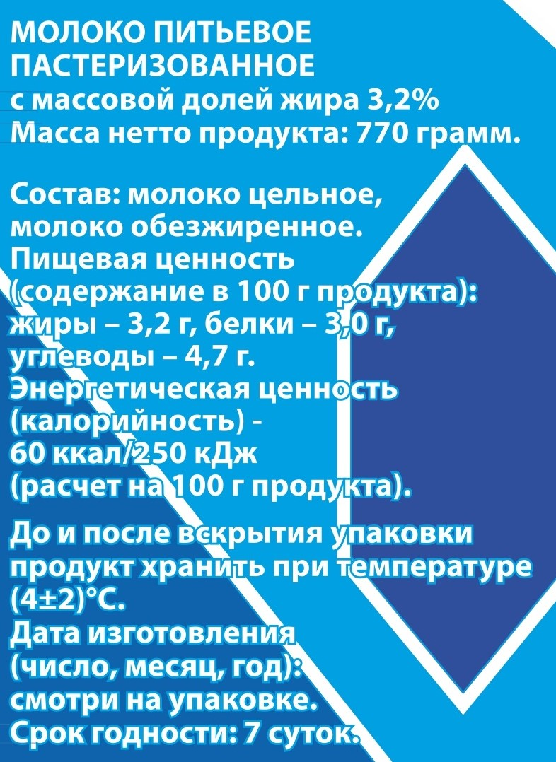 Натуральный продукт, без растительных жиров. Указанную жирность продукта получают путем нормализации, никакого сухого молока. Продукт проходит процесс бережной пастеризации, в результате которого опасные для здоровья человека микроорганизмы уничтожаются. Все полезные вещества сохраняются. В его составе более 100 полезных компонентов, из них около 20 сбалансированных и жирных аминокислот, лактоза, минеральные вещества. В нем, также, содержится суточная доза кальция. Можно использовать как самостоятельный напиток или готовить на его основе другие. Подходит для добавления в выпечку, основные блюда, соусы, коктейли.