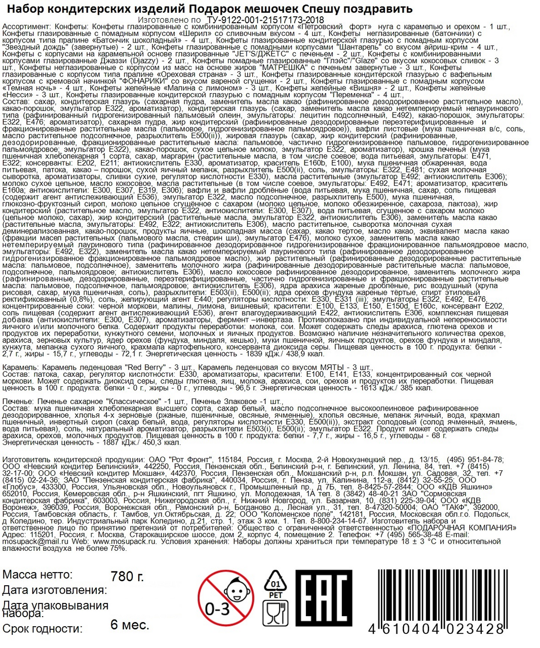 Сладкий набор, МосУпак, Подарок Спешу поздравить - 780гр, содержит кондитерские изделия кондитерских фабрик Невский кондитер, Объединенные кондитеры, КДВ, Коломенское поле. Яркий привлекательный дизайн классического подарка. Кондитерские изделия упакованы в отдельный пластиковый пакет, который находится внутри подарочного мешочка, подобранного атласной лентой. Мешочек выполнен из экологически чистых материалов.