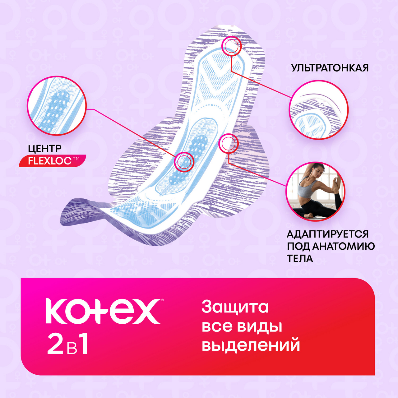 Прокладки Kotex 2в1 созданы специально для тех моментов, когда вам необходима дополнительная защита! Прокладки Котекс 2в1 обеспечивают защиту от всех видов выделений: менструальных и при недержании мочи. Специальный центр FlexLocTM содержит суперабсорбент, который надежно удерживает влагу внутри и нейтрализует запах урины, даря ощущение свежести и уверенности на весь день. Тонкая и гибкая, прокладка надежно держится на белье и адаптируется под анатомию тела, обеспечивая чувство комфорта и легкости. Несмотря на свою тонкость, благодаря усиленному абсорбирующему слою, она впитывает большее количество жидкости, чем более толстые менструальные прокладки, представленные на рынке.