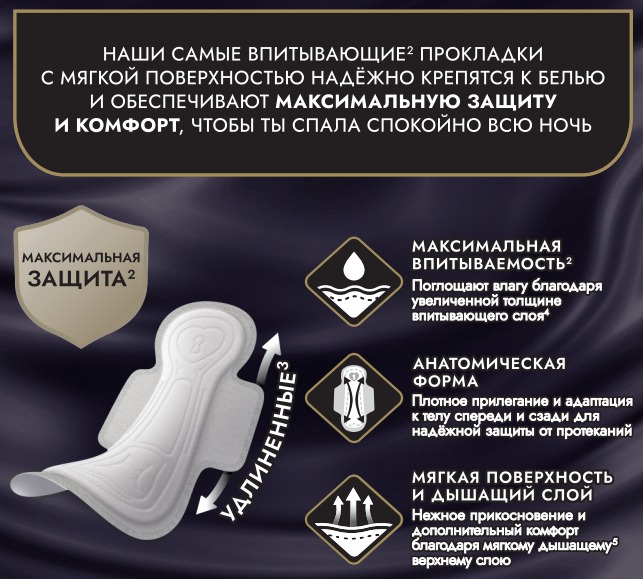 Наши самые впитывающие прокладки с мягкой поверхностью и анатомической формой надежно крепятся к белью и обеспечивают максимальную защиту и комфорт, чтобы ты спала спокойно всю ночь. Увеличенная толщина впитывающего слоя обеспечивает максимальную впитываемость. Благодаря анатомической форме прокладка плотно прилегает к телу и надежно защищает от протеканий. А мягкая поверхность и дышащий верхний слой обеспечивают комфортное соприкосновение с кожей.