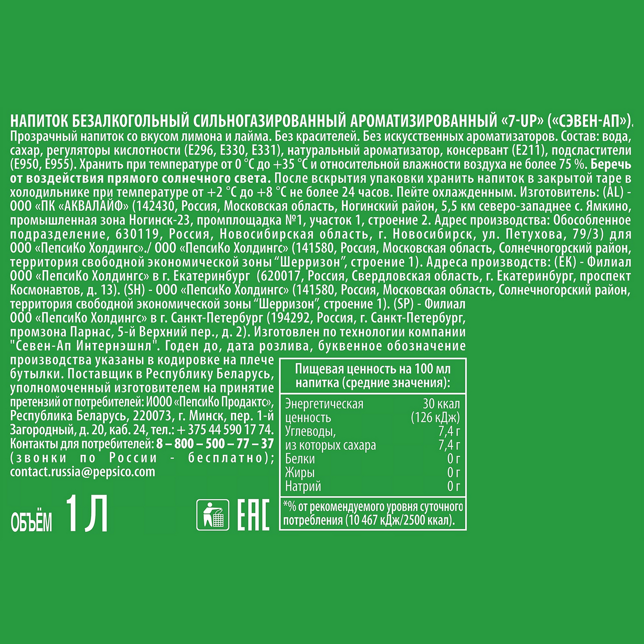 Сэвен Ап - прозрачный напиток со вкусом лимона и лайма. 7UP не содержит красителей и искусственных ароматизаторов.●Сэвен Ап - прозрачный напиток со вкусом лимона и лайма.●7UP - известный во всем мире газированный напиток с ярко выраженными вкусами вкусом спелого лимона и лайма●Отлично утоляет жаждуСэвен Ап - торговая марка газированного напитка со вкусом лимона и лайма, не содержащего кофеина. В 1934 году 7UP стал безалкогольным, перед тем, как он стал безалкогольным, в Сэвен Ап добавлялась небольшая доза алкоголя.
