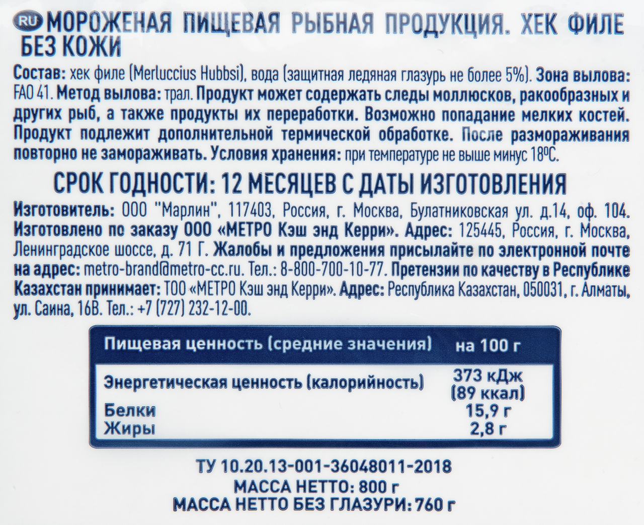 Хек филе, вода(защитная ледяная глазурь не более 5%). Продукт может содержать следы моллюсков, ракообразных и других рыб, а также продукты их переработки. Возможно попадание мелких костей.