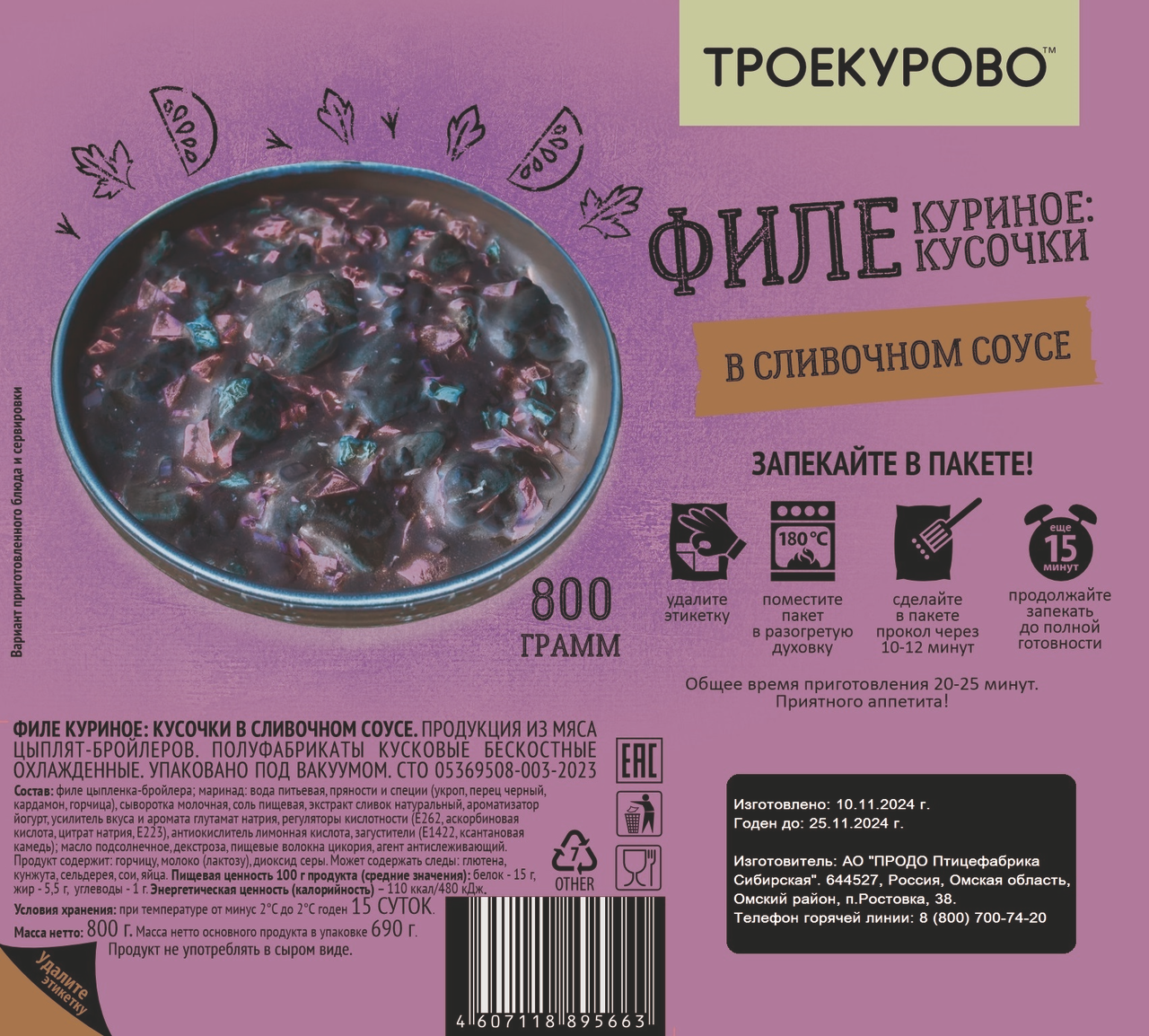 Филе цыпленка-бройлера Троекурово кусочки в сливочном соусе охлажденное, 800г