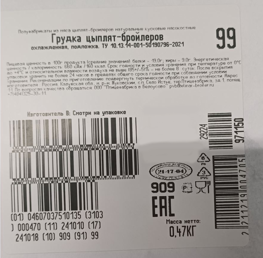 Грудка цыпленка-бройлера Птицефабрика в Белоусово охлажденная, ~800г