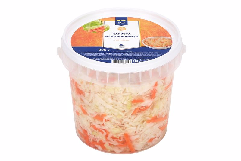 Капуста маринованная Metro Chef с морковью, 800 г – натуральный, полезный и вкусный продукт. Его можно использовать в пищу, просто приправив луком и растительным маслом, так и в составе многих блюд разных кухонь мира. В их числе – русская, украинская, средиземноморская, китайская, корейская и другие. В составе маринованной капусты содержится большое количество витамина С, поэтому она считается отличным профилактическим средством для тех, кто подвержен частым простудным заболеваниям или страдает пониженным иммунитетом. Регулярное употребление капусты стимулирует работу ЖКТ, помогает при интоксикации разного рода. Приобрести капусту маринованную Metro Chef с морковью, 800 г можно в торговом центре METRO.Выпуская продукцию под собственными торговыми марками METRO, мы стремимся максимально удовлетворить потребности наших клиентов. Наша цель – понять, какой ассортимент для них актуален и предложить его по привлекательной цене. Мы также внимательно изучаем тенденции рынка, чтобы быть в курсе последних трендов и своевременно предлагать решения под собственными торговыми марками в соответствии с ними. Бренд METRO Chef хорошо известен во всем мире. Продукция этой торговой марки отличается отменным вкусом и превосходным качеством.