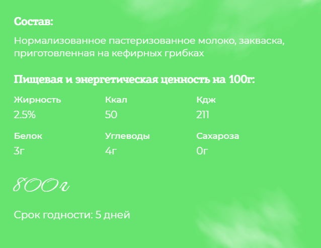 Нормализованное пастеризованное молоко, закваска, приготовленная на кефирных грибках.