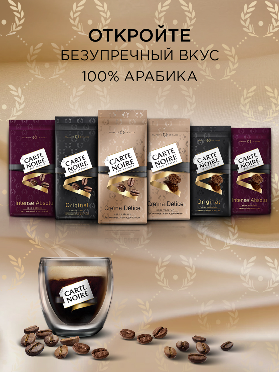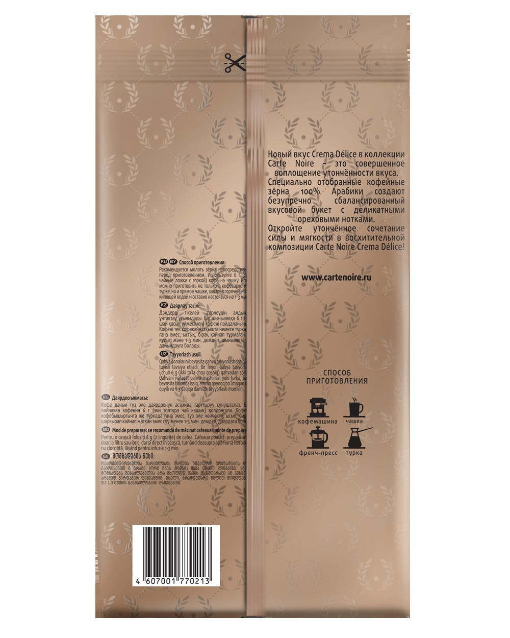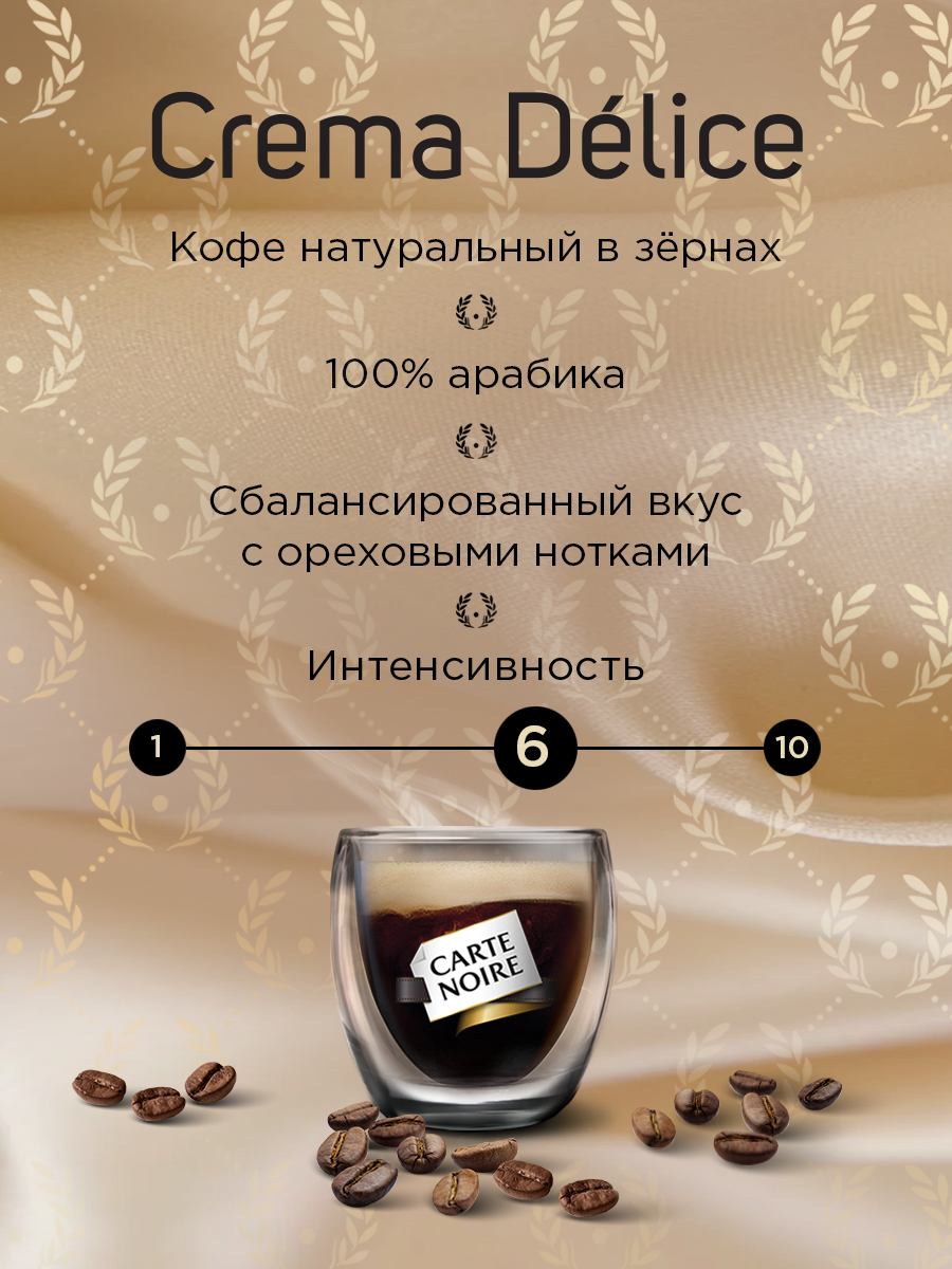 Специально отобранные кофейные зерна 100% Арабики создают безупречно сбалансированный вкусовой букет с деликатными ореховыми нотками. Откройте утончённое сочетание силы и мягкости в восхитительной композиции Carte Noire Crema Delice.