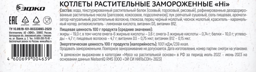 Котлеты растительные Hi классические замороженные, 800г - это инновационные продукты для тех, кто бережно относится к своему здоровью. Полезная альтернатива классическому мясу, которая не уступает ему по вкусу и пищевой ценности. Сочный фарш из растительного мяса, репчатый лук, чеснок и щепотка ароматных специй - котлеты подойдут к любому гарниру и порадуют вас своим сбалансированным и пикантным вкусом. Растительные котлеты содержат Омега-3, Омега-6, железо, кальций и обогащены витаминами D3 и B12. Подходит для питания: веган, вегетарианцы, халяль, пост, фитнес, диета при избыточном весе.