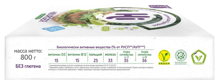 Вода, текстурированный растительный белок (соевый, гороховый, рисовый), рафинированные дезодорированные растительные масла (рапсовое, кокосовое, подсолнечное), лук репчатый сушеный, цитрусовые пищевые волокна, соль пищевая, ароматизаторы натуральные, чеснок молотый, перец черный молотый, зелень петрушки, краситель - карамельный колер, витамин В7, витамин В12.