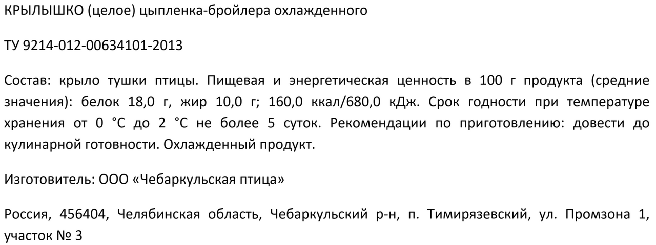 Крылышко цыпленка-бройлера Чебаркульская птица целое охлажденное, ~800г