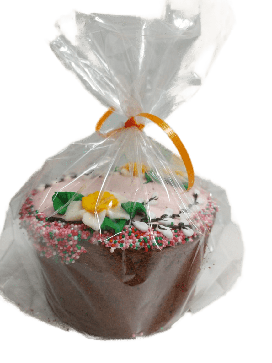 Традиционная пасхальная выпечка. Вкусный и ароматный продукт приготовлен по классическому рецепту. Сверху кулич покрыт сладкой глазурью и дополнен разноцветным украшением.