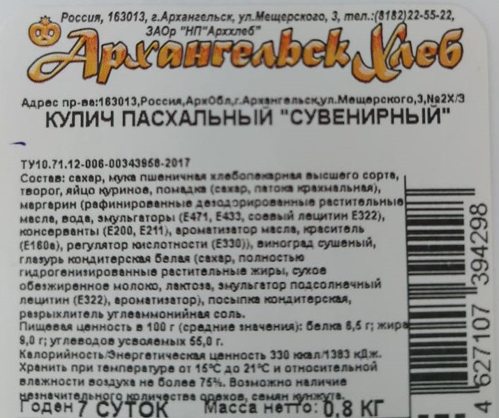 Кулич Архангельскхлеб Сувенирный, 800г