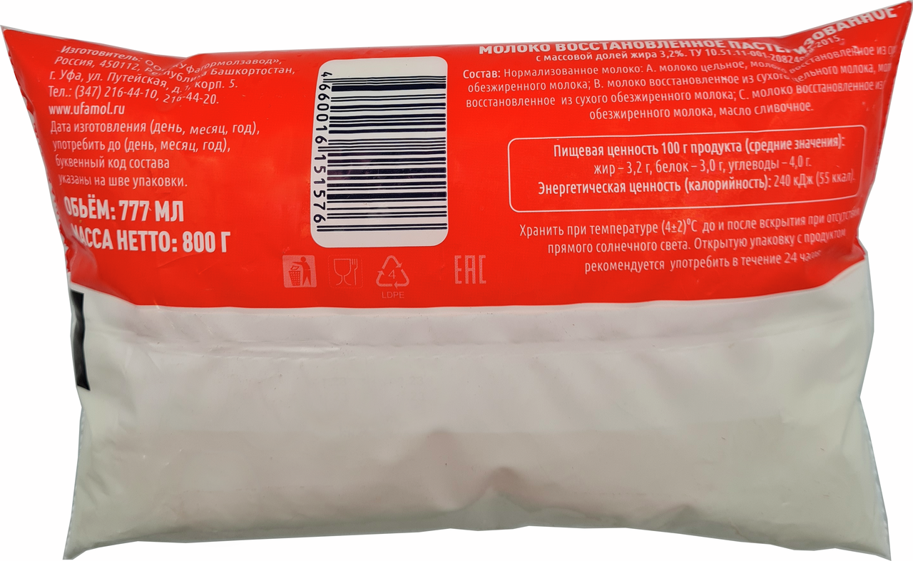 Молоко Молочный фермер 3.2%, 800г БЗМЖ (без заменителя молочного жира) обрабатывают по специальной технологии. В результате все содержащиеся в продукте вредных микроорганизмы погибают, а полезные вещества полностью сохраняют свои первоначальные свойства. Кроме того, при таком способе обработки не меняется вкус, что важно для тех, кто предпочитает употреблять данный продукт в чистом виде. Молоко обладает насыщенным белым цветом и приятным вкусом. Его можно употреблять в качестве отдельного напитка, а также добавлять в кофе, чай или какао. Молоко чаще всего используется в кулинарных целях. Оно необходимо при приготовлении каш и омлетов, входит в состав теста для выпекания блинчиков, требуется для получения манников и другой сладкой выпечки. Он является незаменимым ингредиентом для молочных коктейлей и киселей. На основе молока делают различные кремы. Этот продукт не только отличается отменным вкусом, но и приносит пользу организму. Благодаря особой технологии обработки в нем сохраняются кальций, калий, железо и другие элементы, аминокислоты, витамины С, Е, Д и группы В в максимальной концентрации. Употребляя молоко, укрепляется костная ткань, улучшается состояние кожи и волос, нормализуется пищеварение и ускоряется метаболизм. Оно помогает избавиться от лишнего веса и токсинов, снимает отеки, положительно влияет на состояние нервной системы, повышает иммунитет.