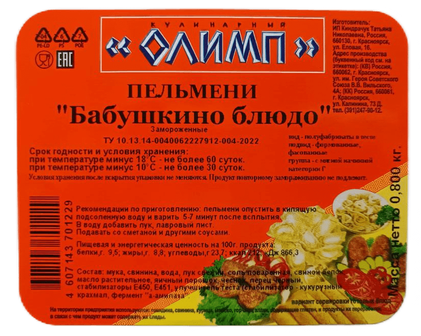 Пельмени Кулинарный Олимп бабушкино блюдо, 800г